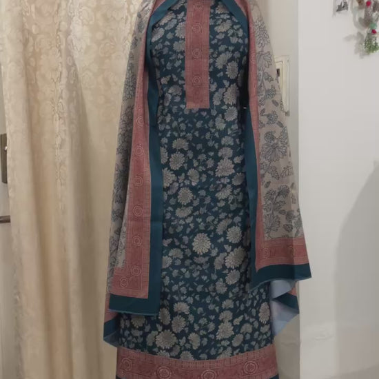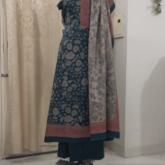 This Dark Blue Woolen Suit is the perfect mix of comfort and style. Made from soft toosh wool, it feels warm, cozy, and perfect for winters. The dark blue color with beige floral print gives it a pretty and elegant look, while the neck patti design adds a nice finishing touch.