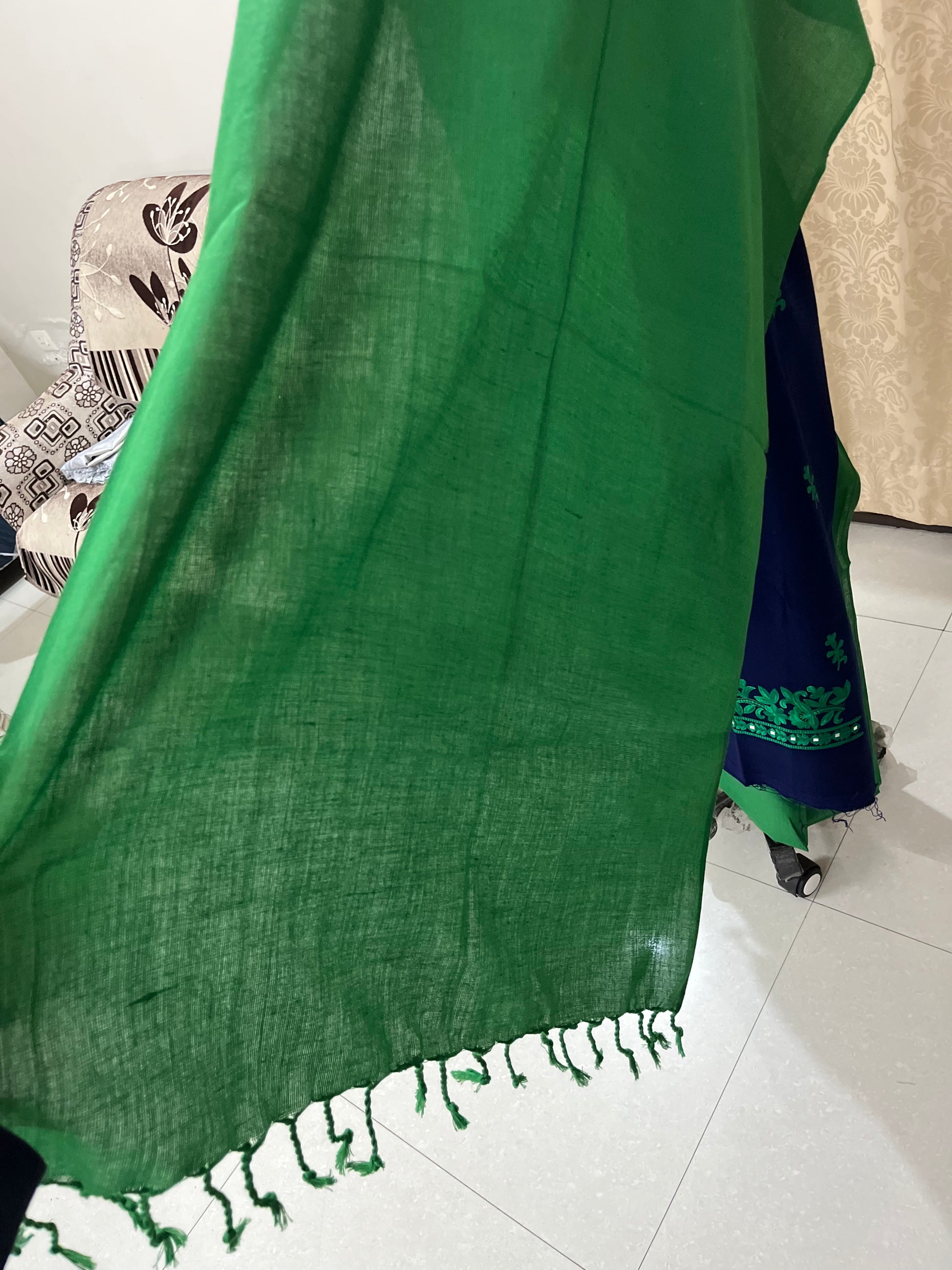 The set comes with a plain contrasting bottom and a matching stole finished with elegant tassels, making it perfect for stylish winter wear.