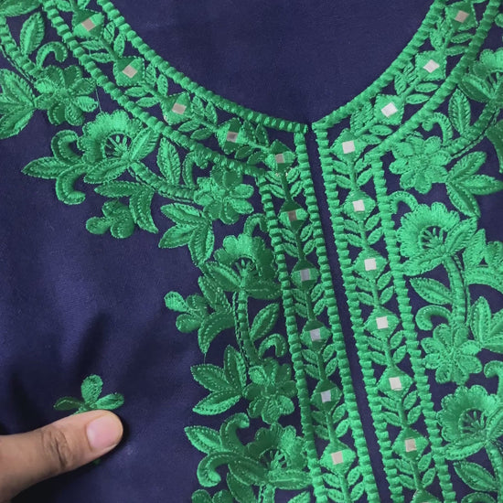 This suit is crafted from pure cashmilon fabric, offering a soft, warm, and comfortable feel. It features beautiful embroidery in a contrasting colour with mirror work adding a classic handcrafted touch.