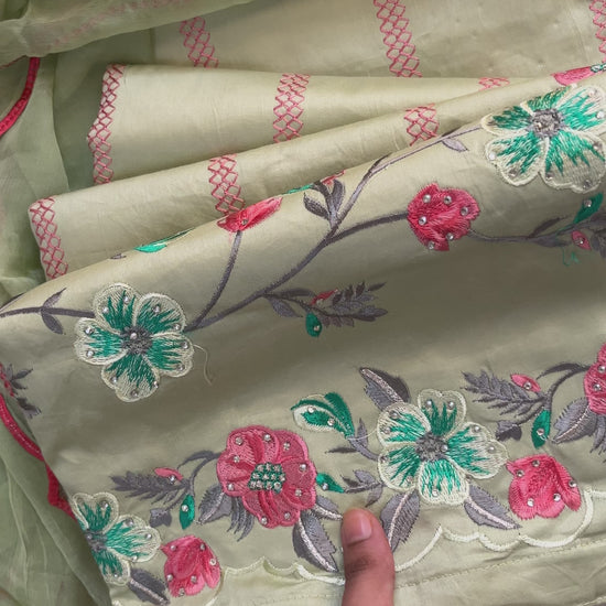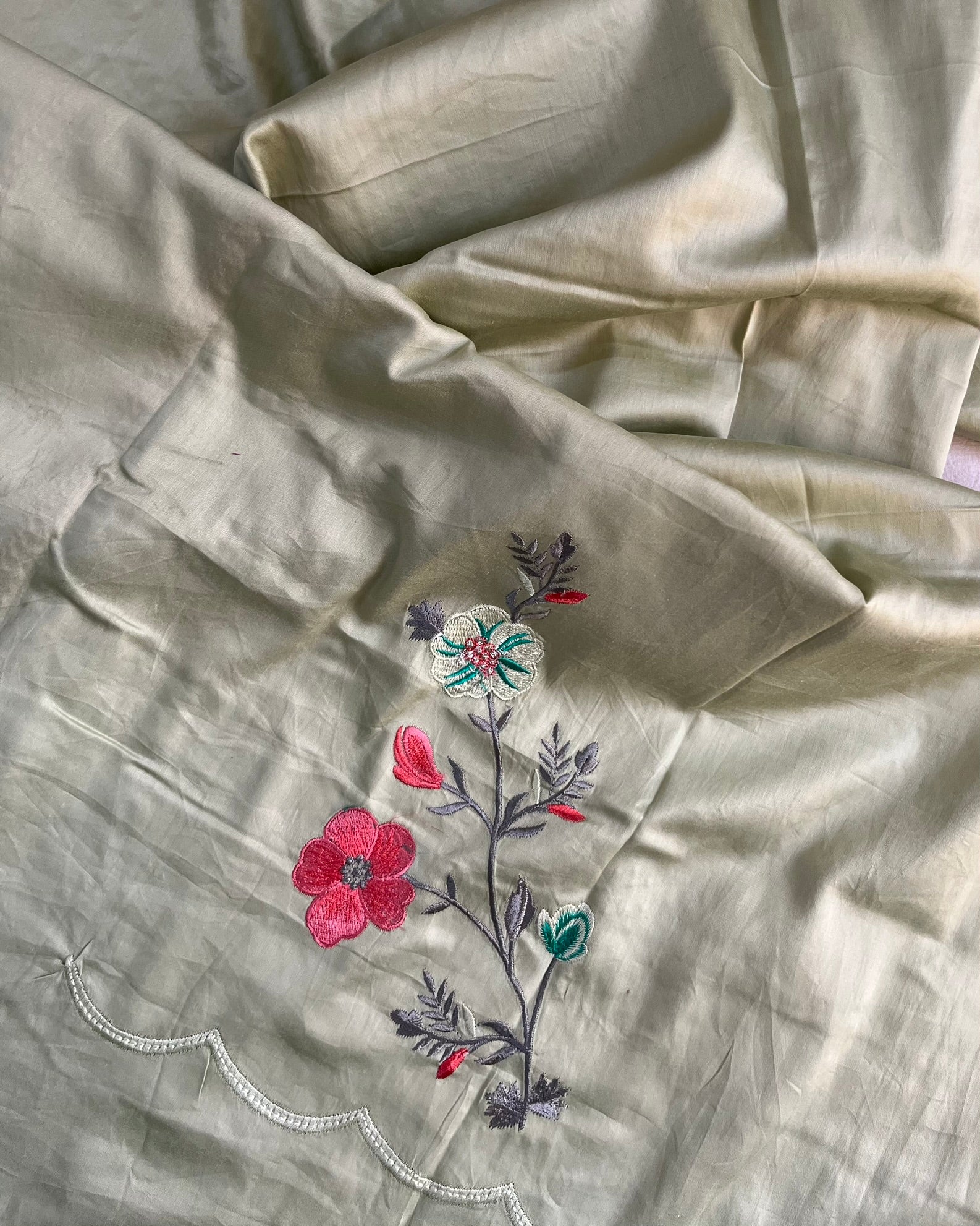 This summer, add this green suit in premium jaam cotton to your wardrobe. The fabric is soft, breathable, and perfect for daily wear in hot weather. It comes with floral embroidery on the top hem, a bottom with embroidered hems, and a chiffon dupatta finished with delicate scalloped hems. With ample fabric length, you can get it tailored to your style while enjoying a look that’s both comfortable and graceful.