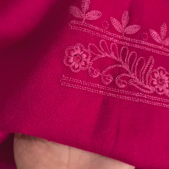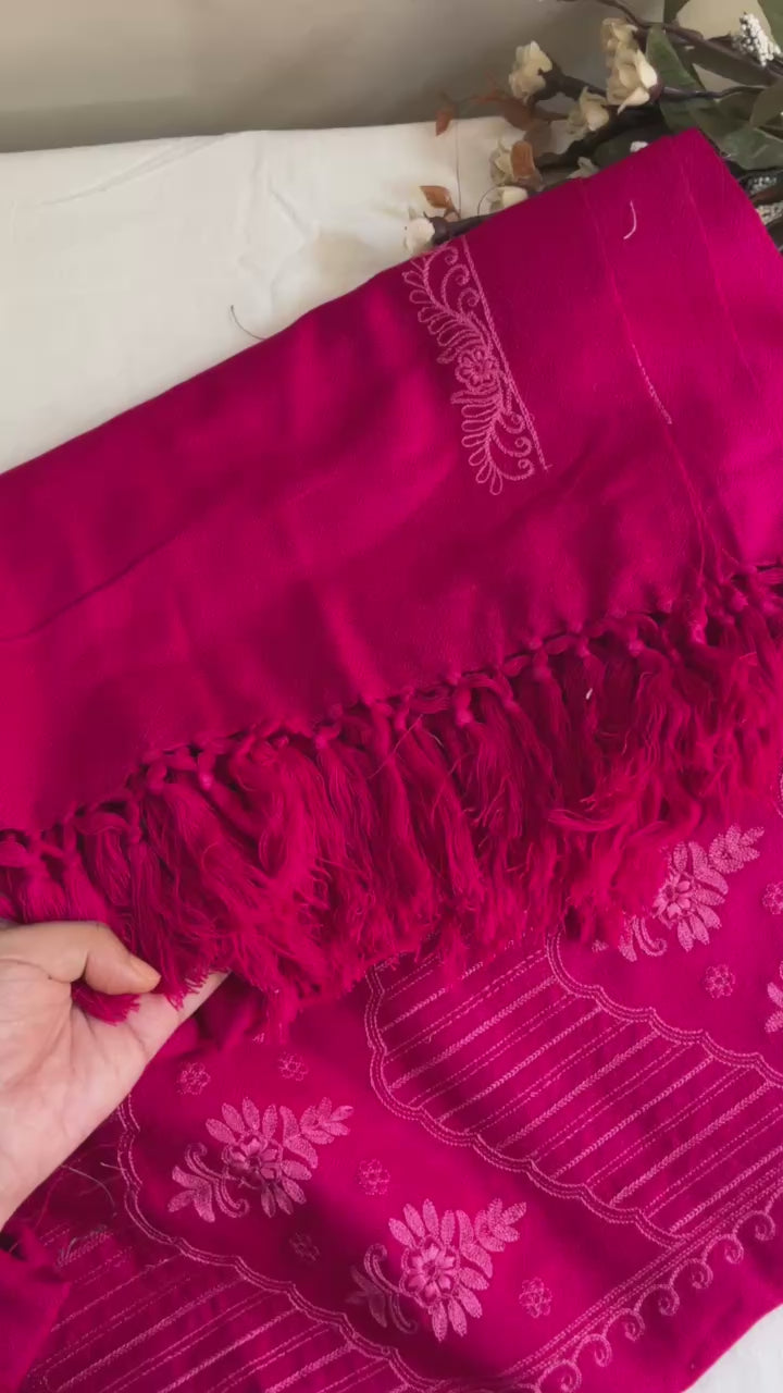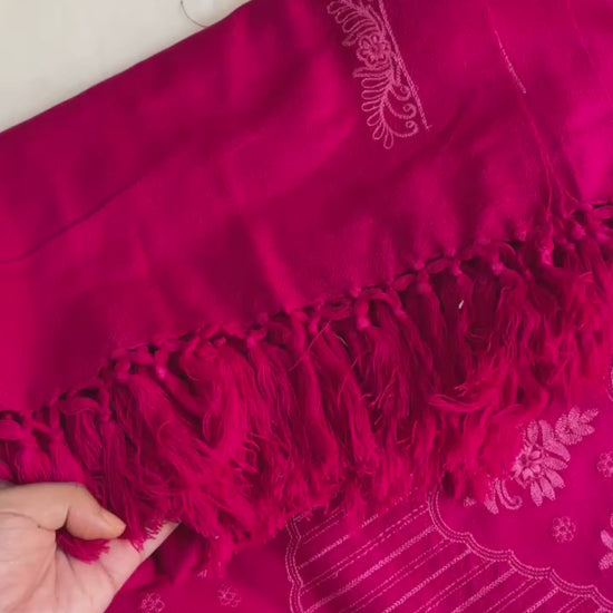 Vibrant fuchsia pink wool blend suit featuring exquisite full panel embroidery for a rich, elegant look. The matching pink stole is detailed with embroidered hems and finished with tassels, adding a graceful touch. Crafted from premium-quality wool, the fabric is soft, durable, and lint-free, designed to keep you warm and stylish through even the coldest winters.