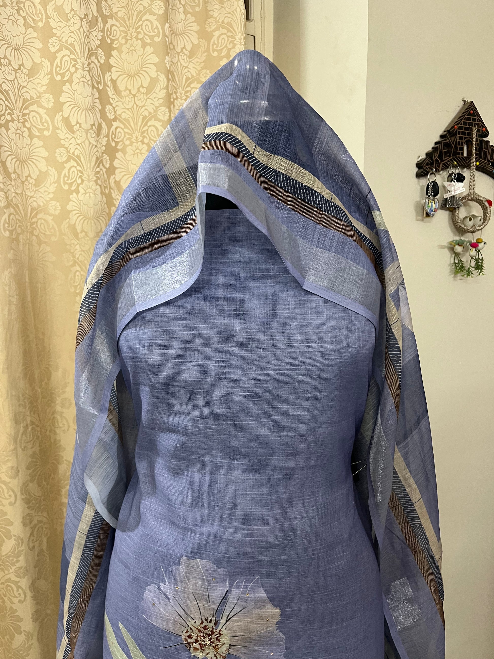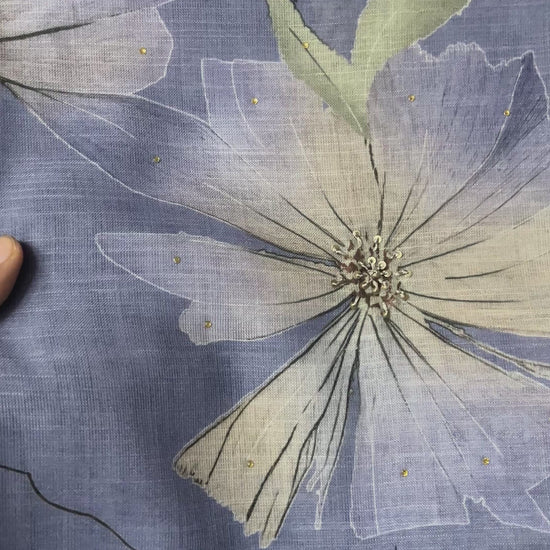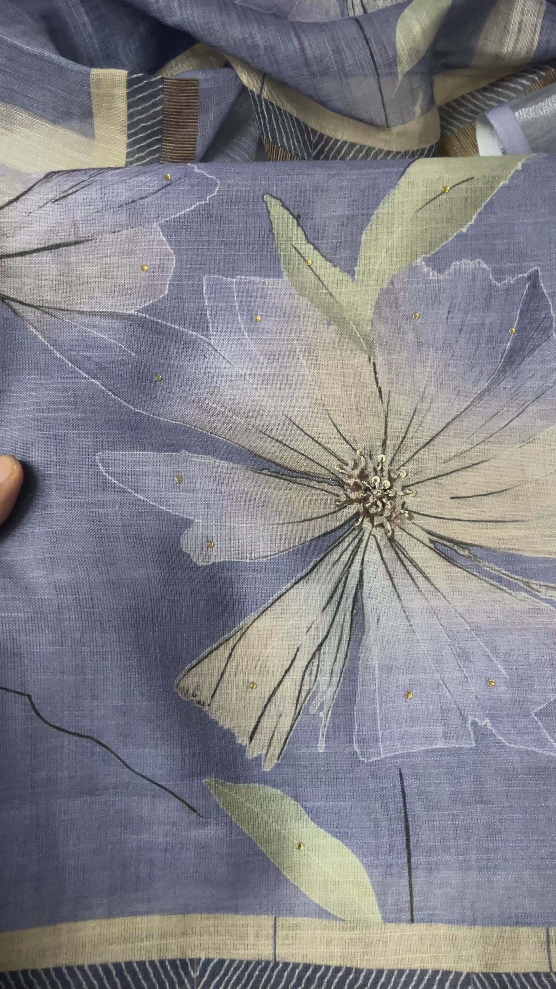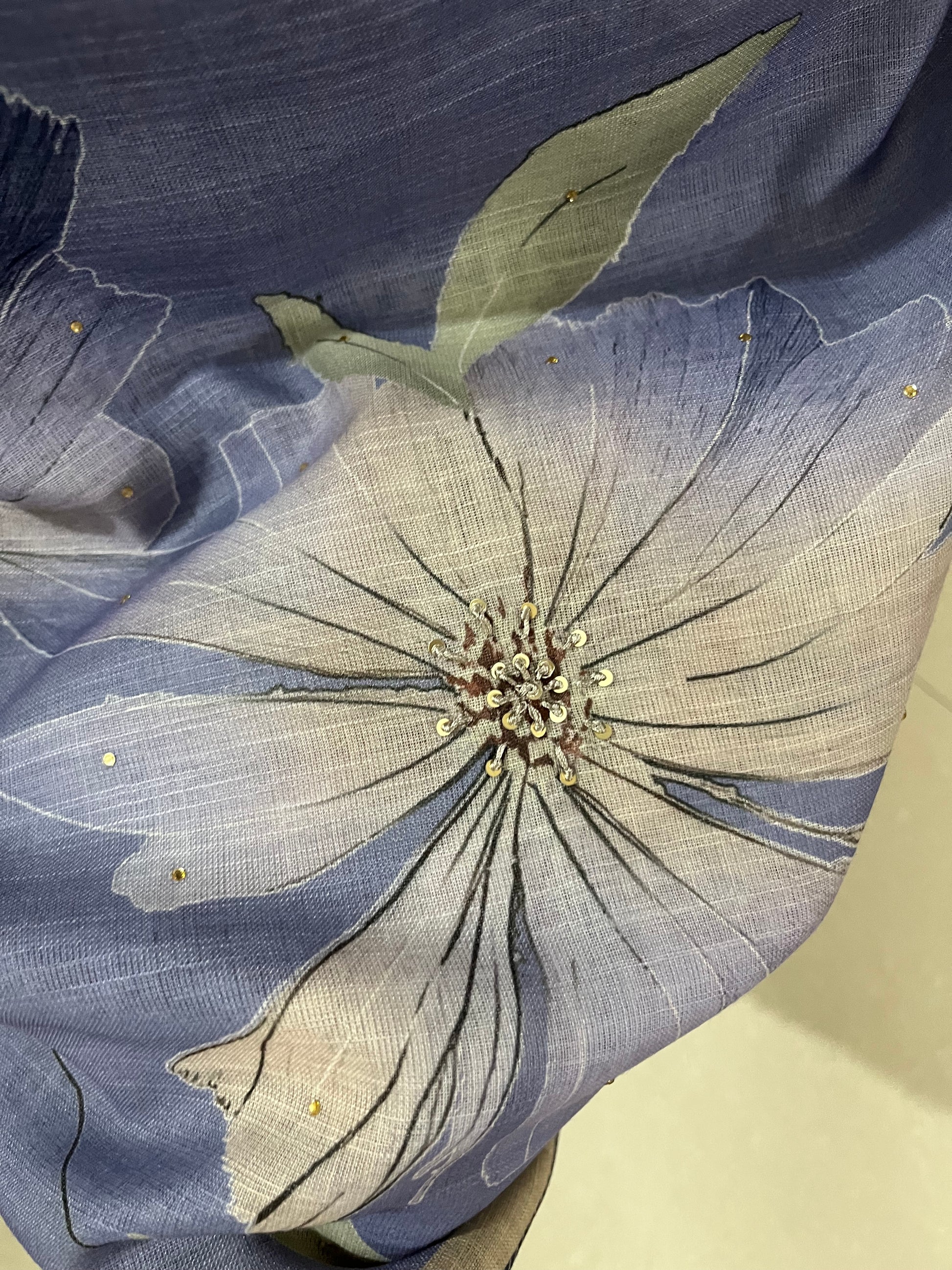 Soft premium linen suit featuring an elegant floral print with delicate sequin handwork on the front and lace on the hemline.