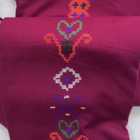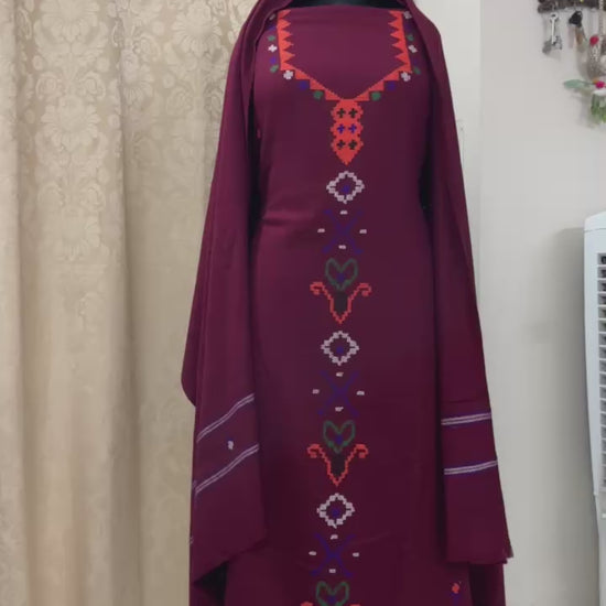 Dark maroon woolen suit in traditional Himachali Kullu style, featuring all-over woven-inspired print that reflects the heritage of the hills. Paired with a matching stole in coordinating Kullu design, this set blends culture with comfort. The high-quality fabric is warm, soft, and completely lint-free, making it an excellent choice for daily wear in the heavy winters.