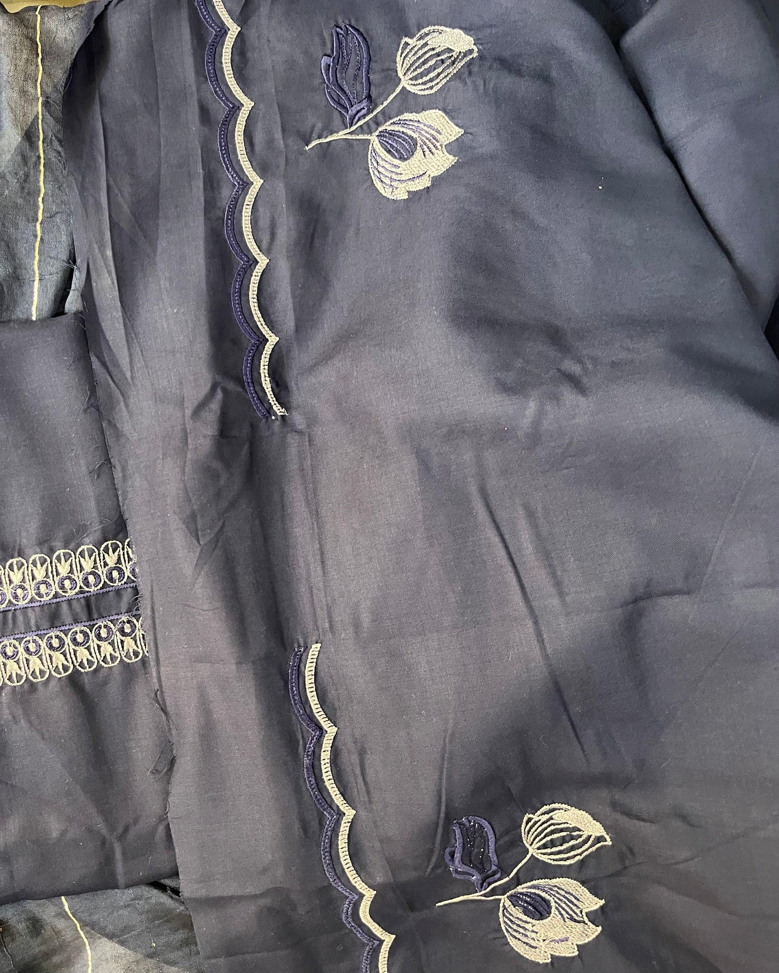 This navy blue cotton suit is all about soft, summer comfort with a touch of style. The shirt comes with floral machine embroidery on the neck and hem, giving it a fresh and pretty look. The bottom also has embroidery on the hem, so even the simple parts feel dressed up. To match, there’s a light cotton dupatta finished with lace, easy to carry and perfect for daily wear.