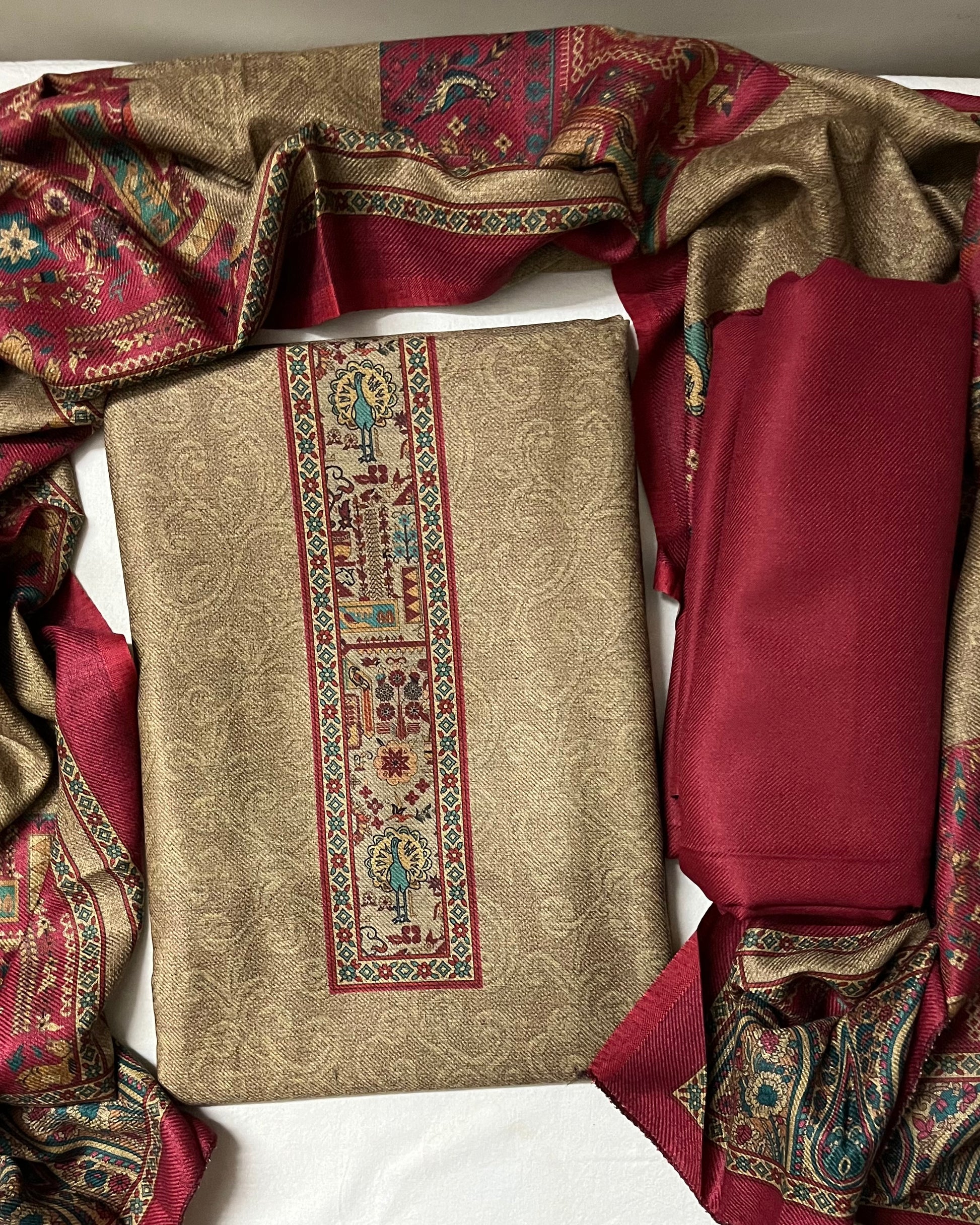 This Beige Pink Woolen Suit is the perfect blend of comfort and timeless style. Made from super fine pashmina fabric, it feels soft, warm, and light — ideal for everyday winter wear. The self-design beige base beautifully complements the pink accents, giving it a refined ethnic look that’s easy to carry all day.