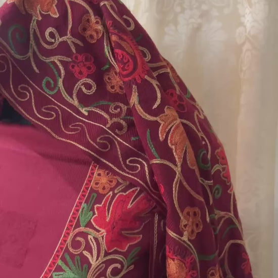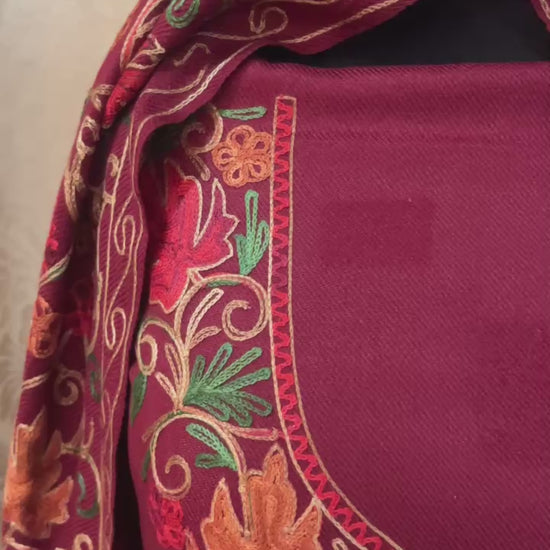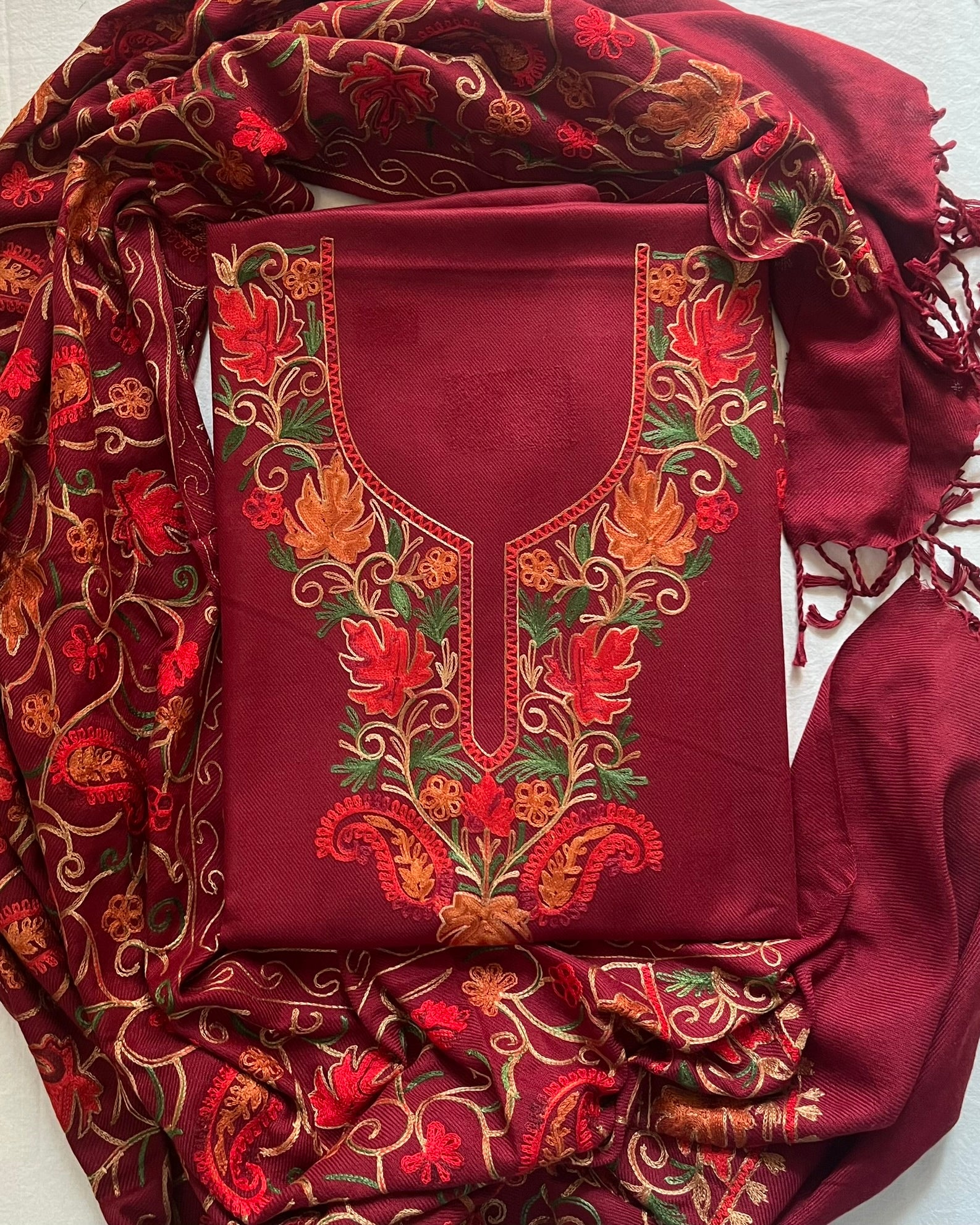 Kashmiri Embroidered Woolen Suit with Full Jaal Stole - Red