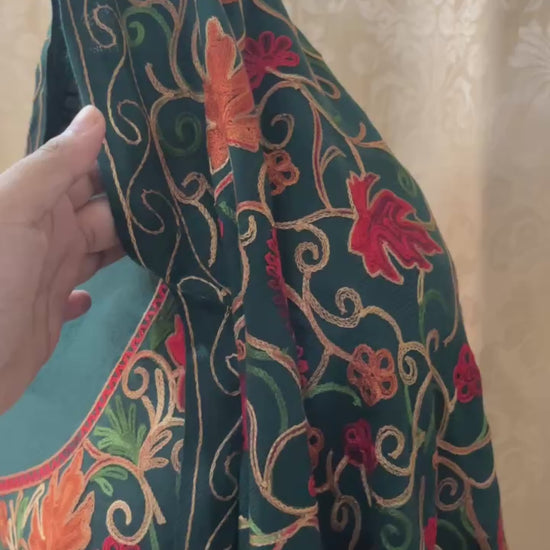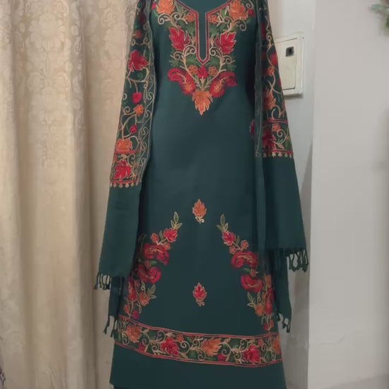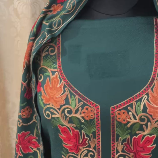 Kashmiri Embroidered Woolen Suit with Full Jaal Stole - Peacock Green