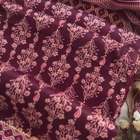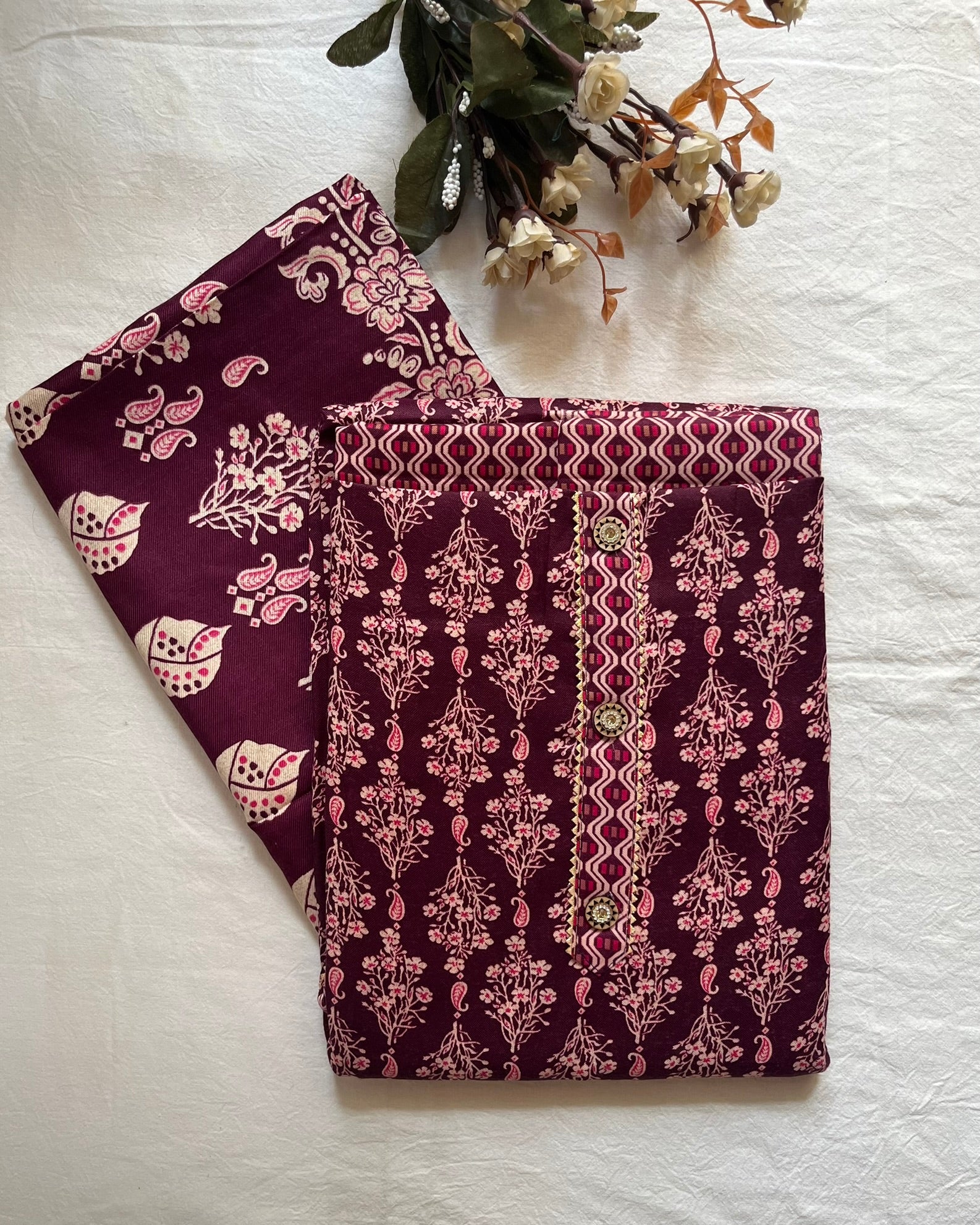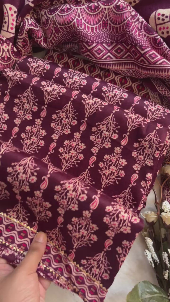 Warm wool blend suit featuring a stylish neck patti with button and lace detailing, complemented by matching lace on the hem. Comes with a printed bottom and a coordinated stole — a cozy and affordable choice for everyday winter wear.