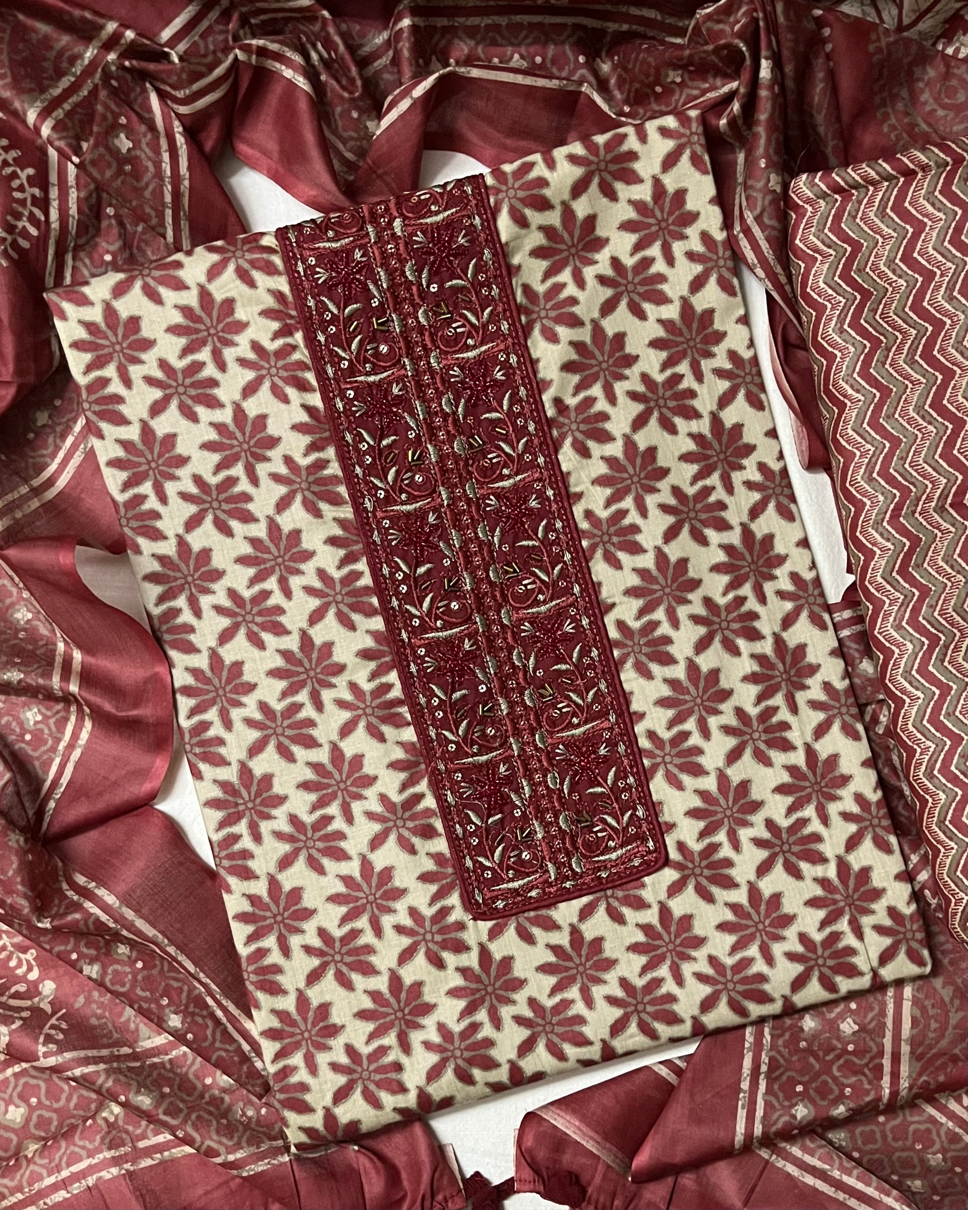 Nagma Pure Cotton Suit Set with Hand Embroidered Neck Patch - Rustic Red