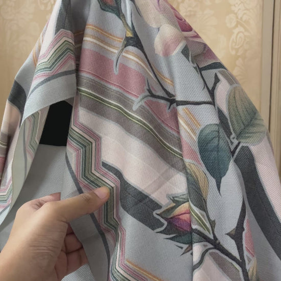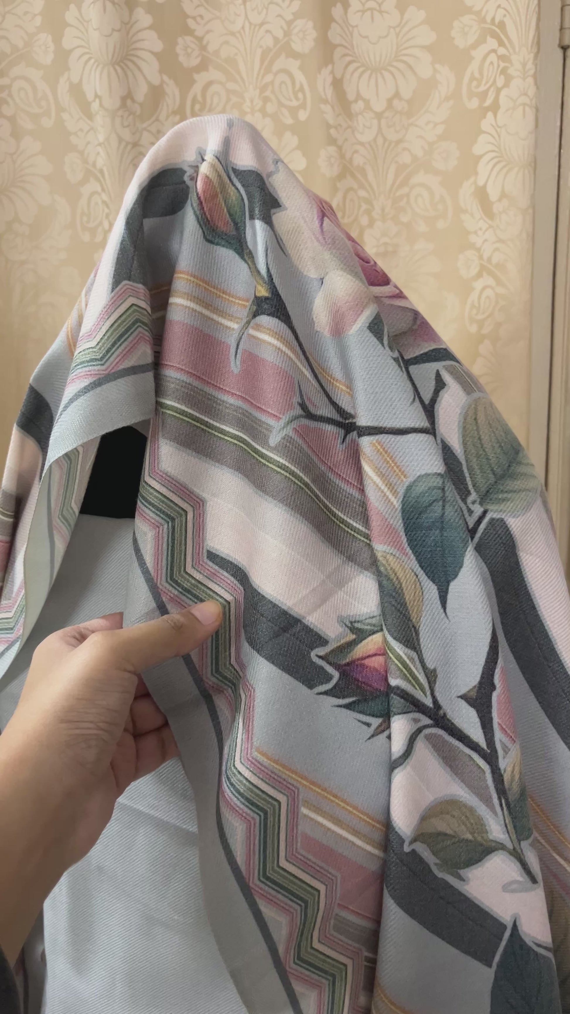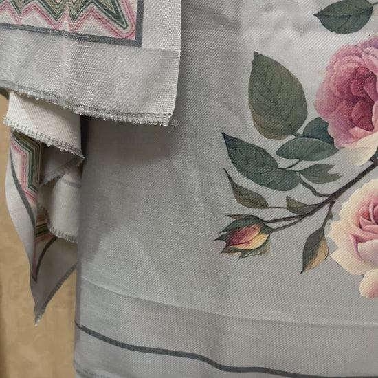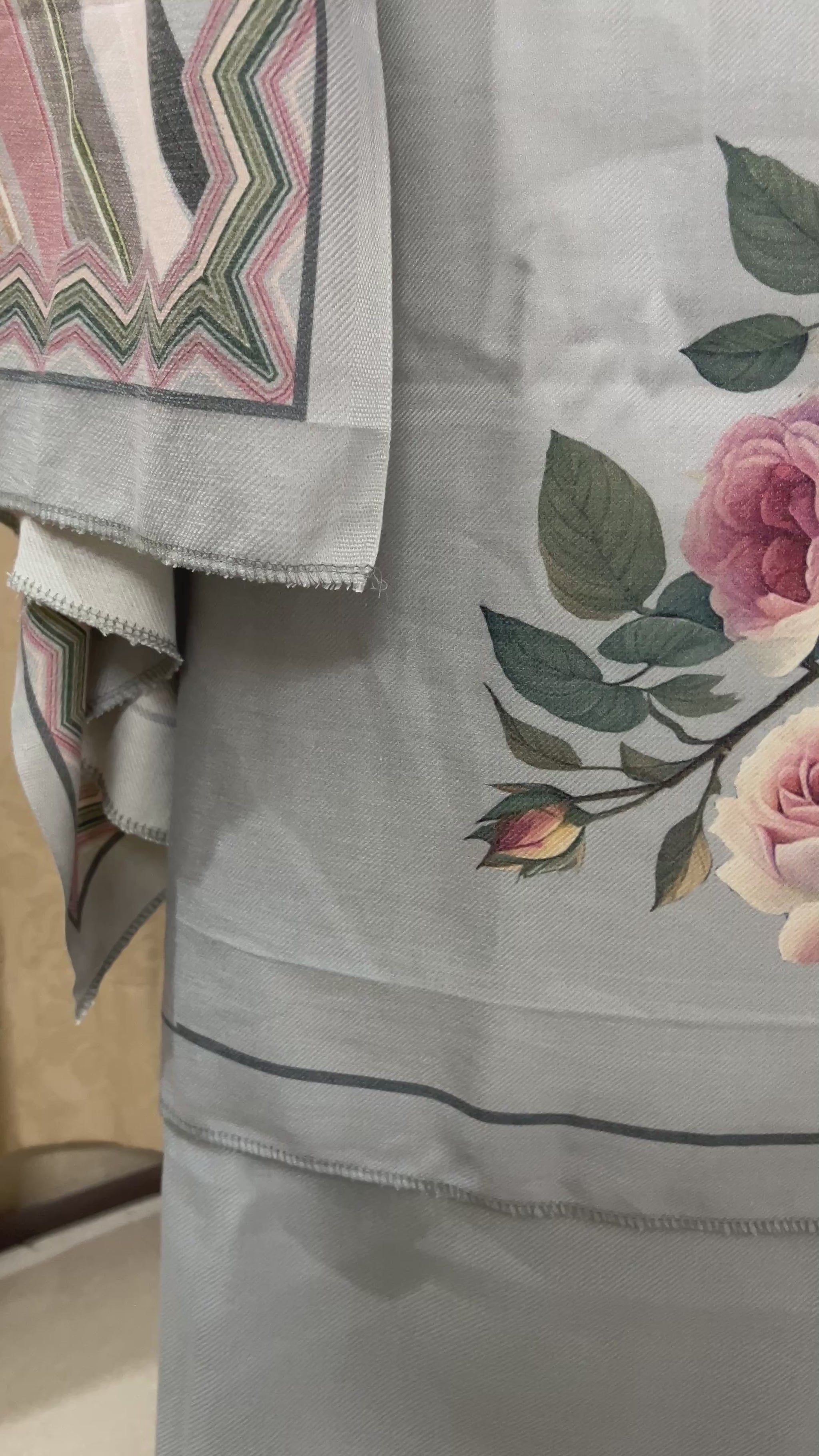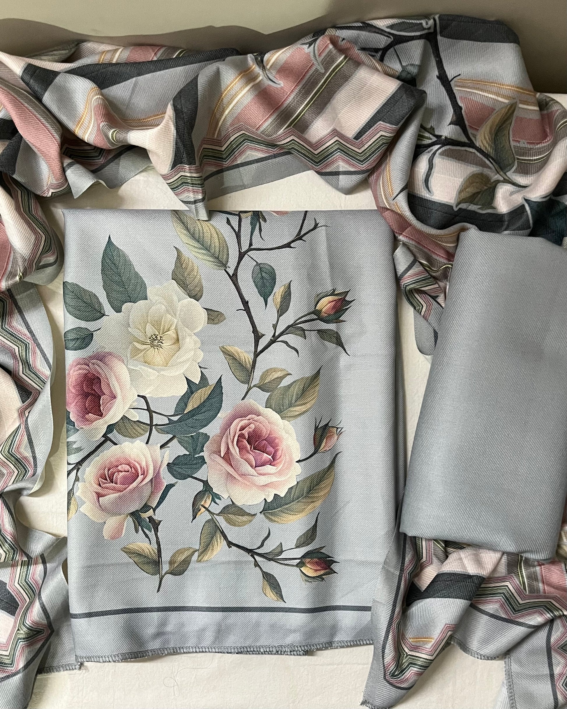 This elegant Toosh Pashmina Suit comes in a soft powder-blue shade, adorned with delicate digital floral artwork. The hemline features beautifully arranged florals that add a refined touch without overwhelming the look.
