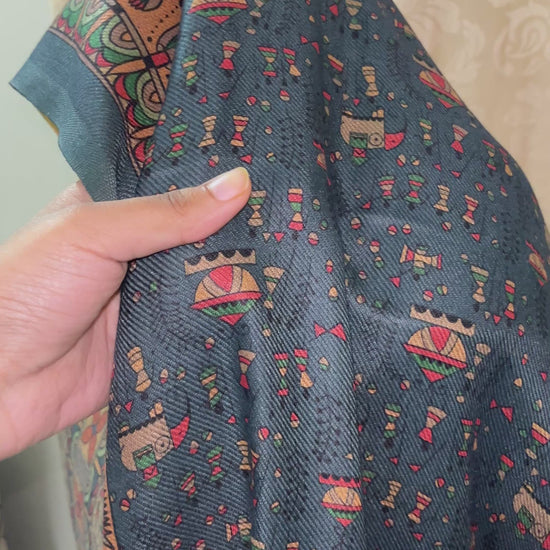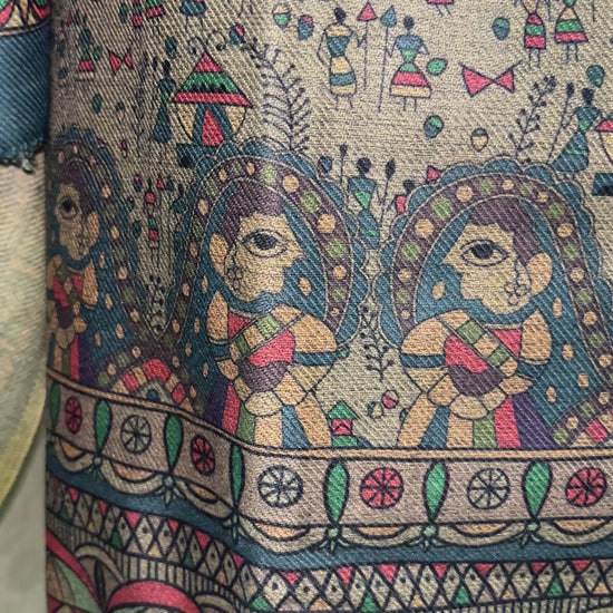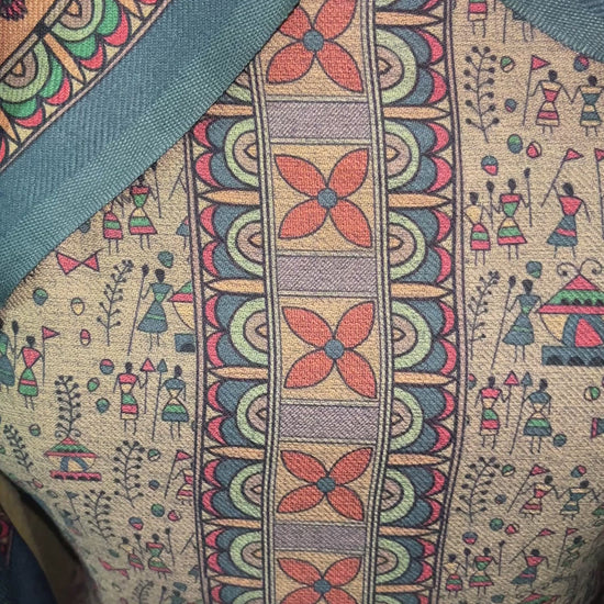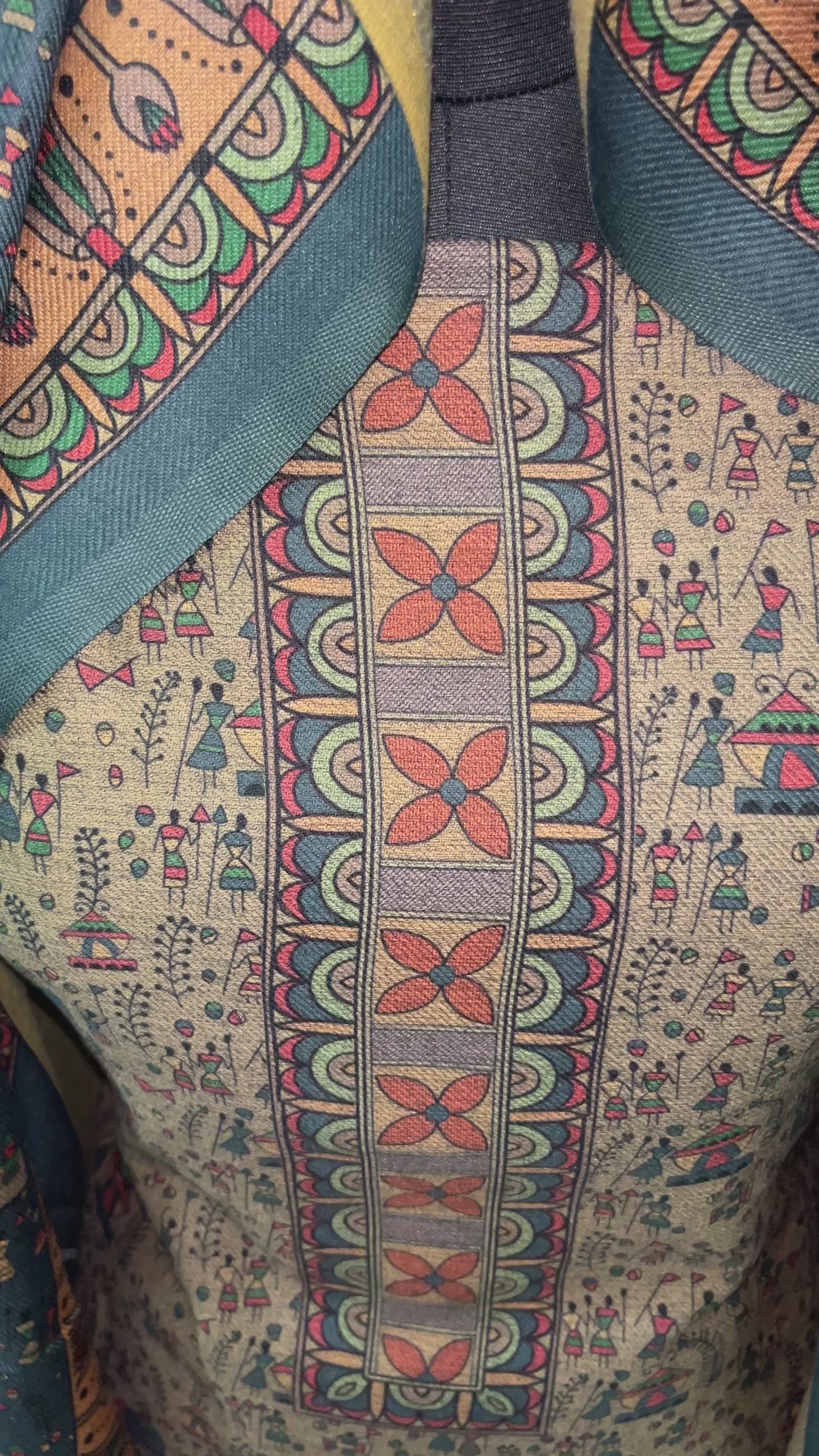 This Steel Blue Beige Woolen Suit is the perfect mix of comfort and style. Made from super fine Toosh wool, it feels soft, warm, and elegant, making it ideal for winter gatherings. The blue hue with a beige base gives a fresh, graceful look, while the beautiful Warli print and floral neck patti add a touch of traditional charm with a modern twist.