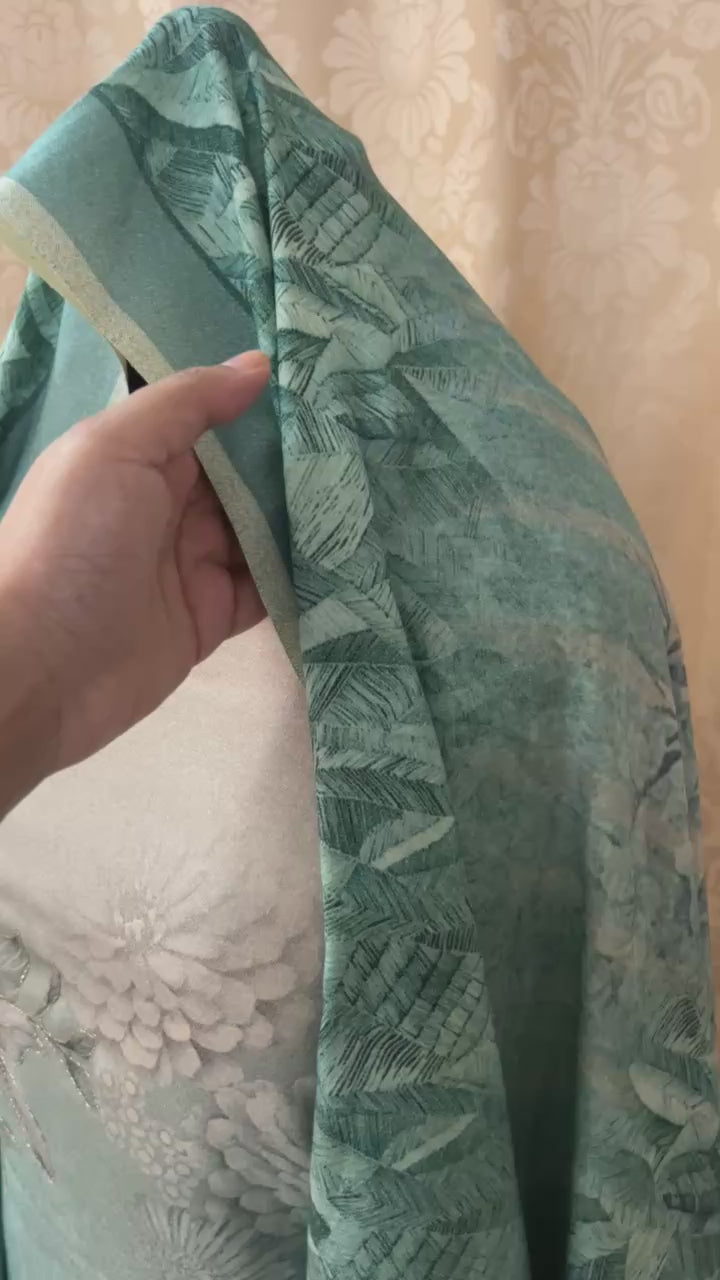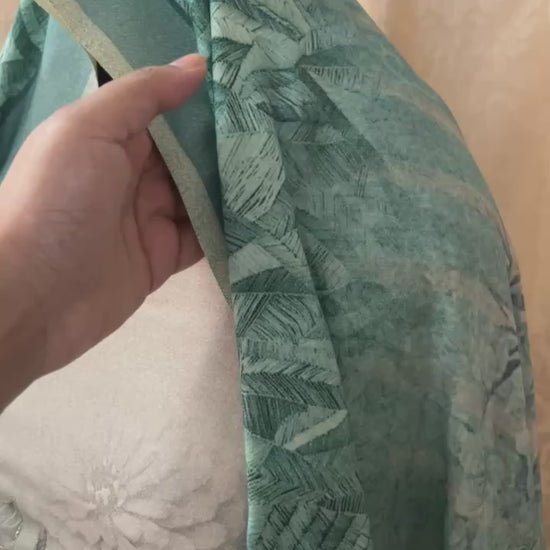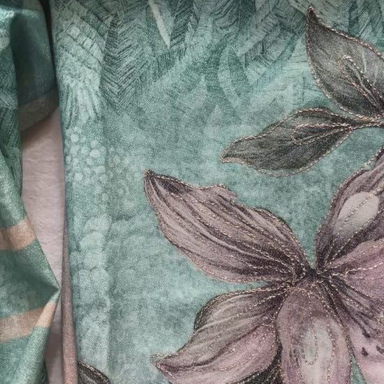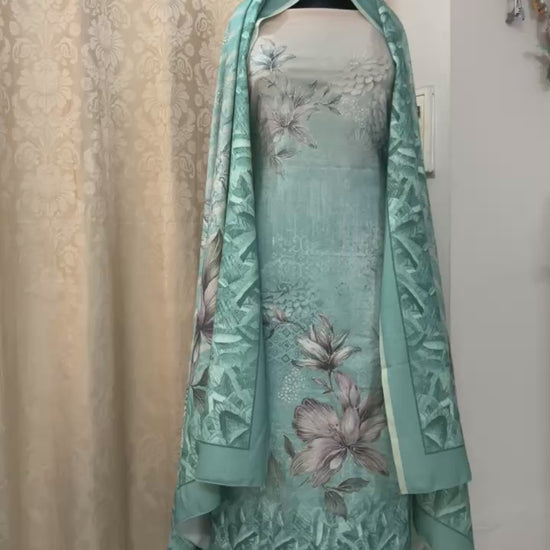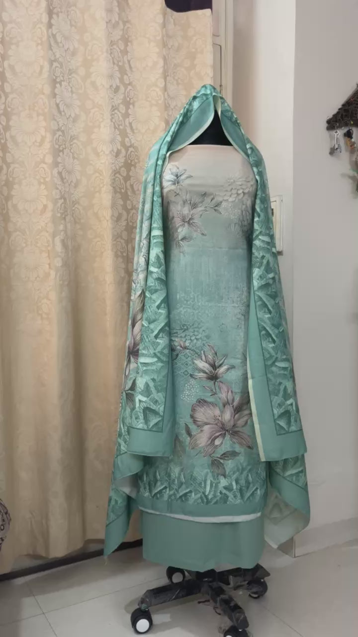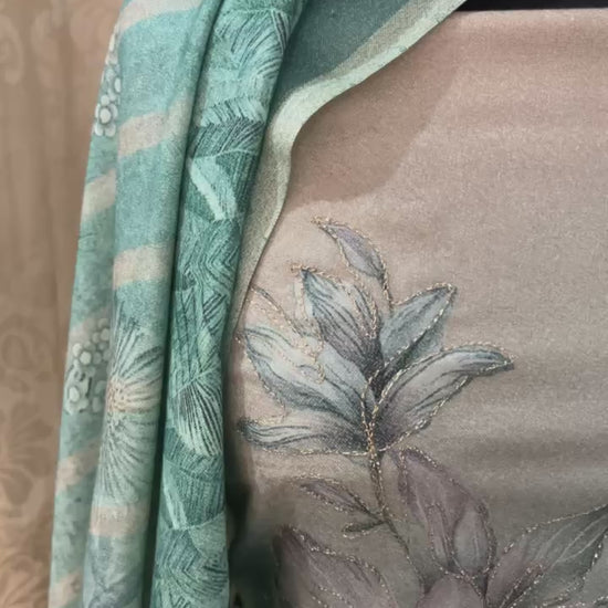 This Ombre Blue Beige Viscose Pashmina Suit beautifully blends warmth with sophistication. Crafted from ultra-soft viscose pashmina fabric, it drapes effortlessly while keeping you cozy during the colder months. The ombré effect — shifting gracefully from beige to deep blue — is adorned with delicate digital floral prints and highlighted with subtle aari work that adds a gentle shimmer.