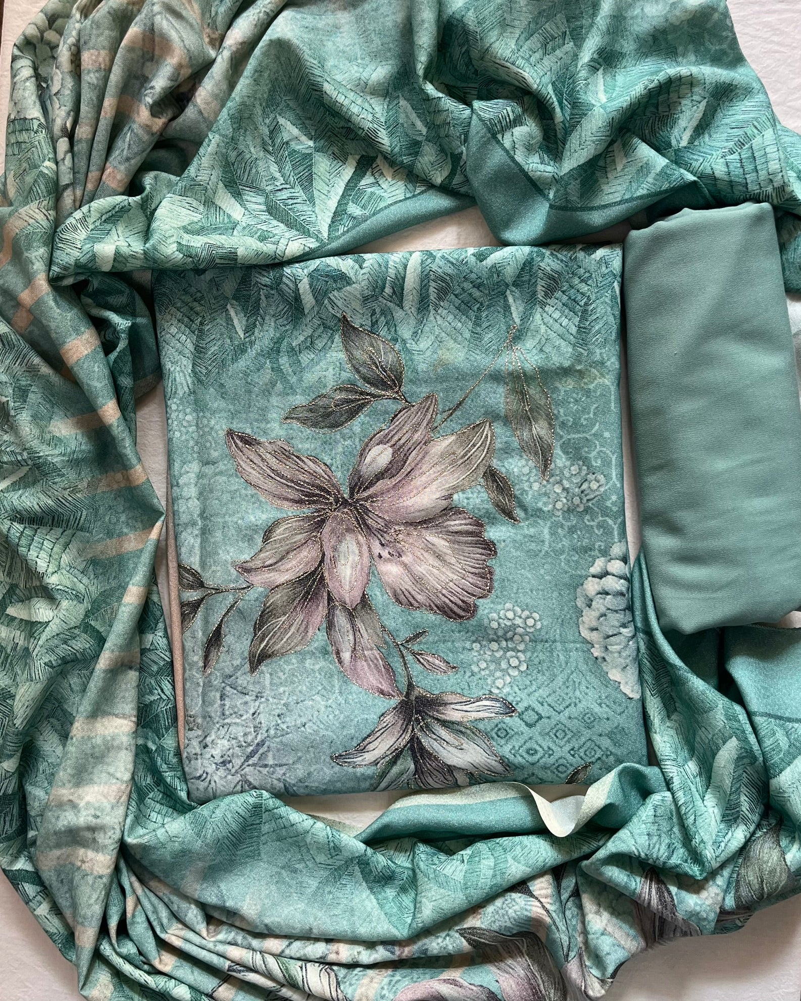 The matching stole carries an all-over digital print, completing the coordinated and polished look. Paired with a plain blue bottom, this suit is perfect for parties and festive evenings when you want to stay warm yet look effortlessly stylish.