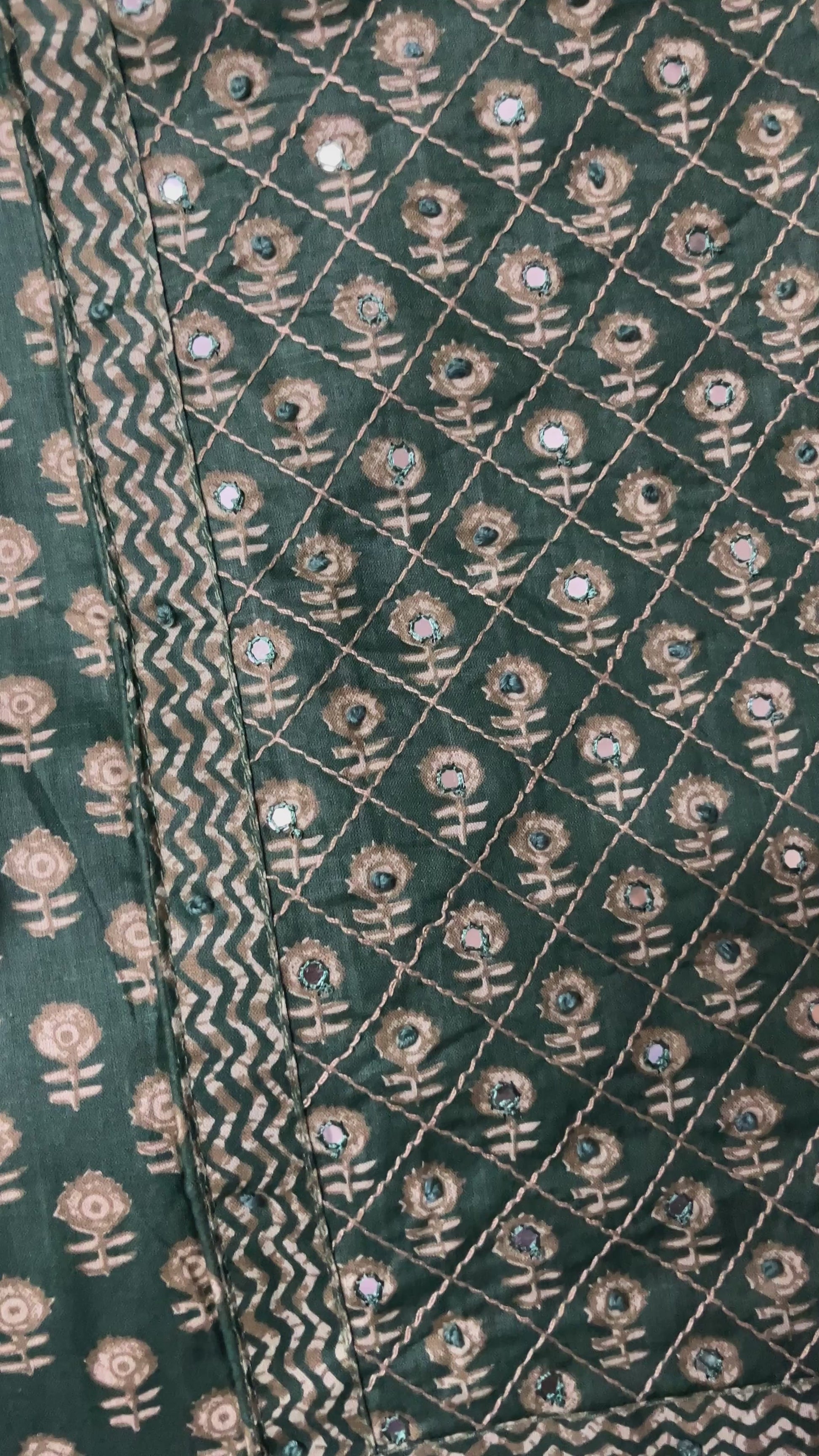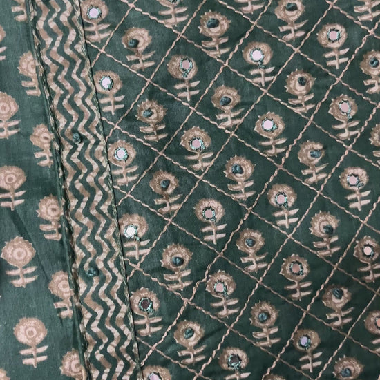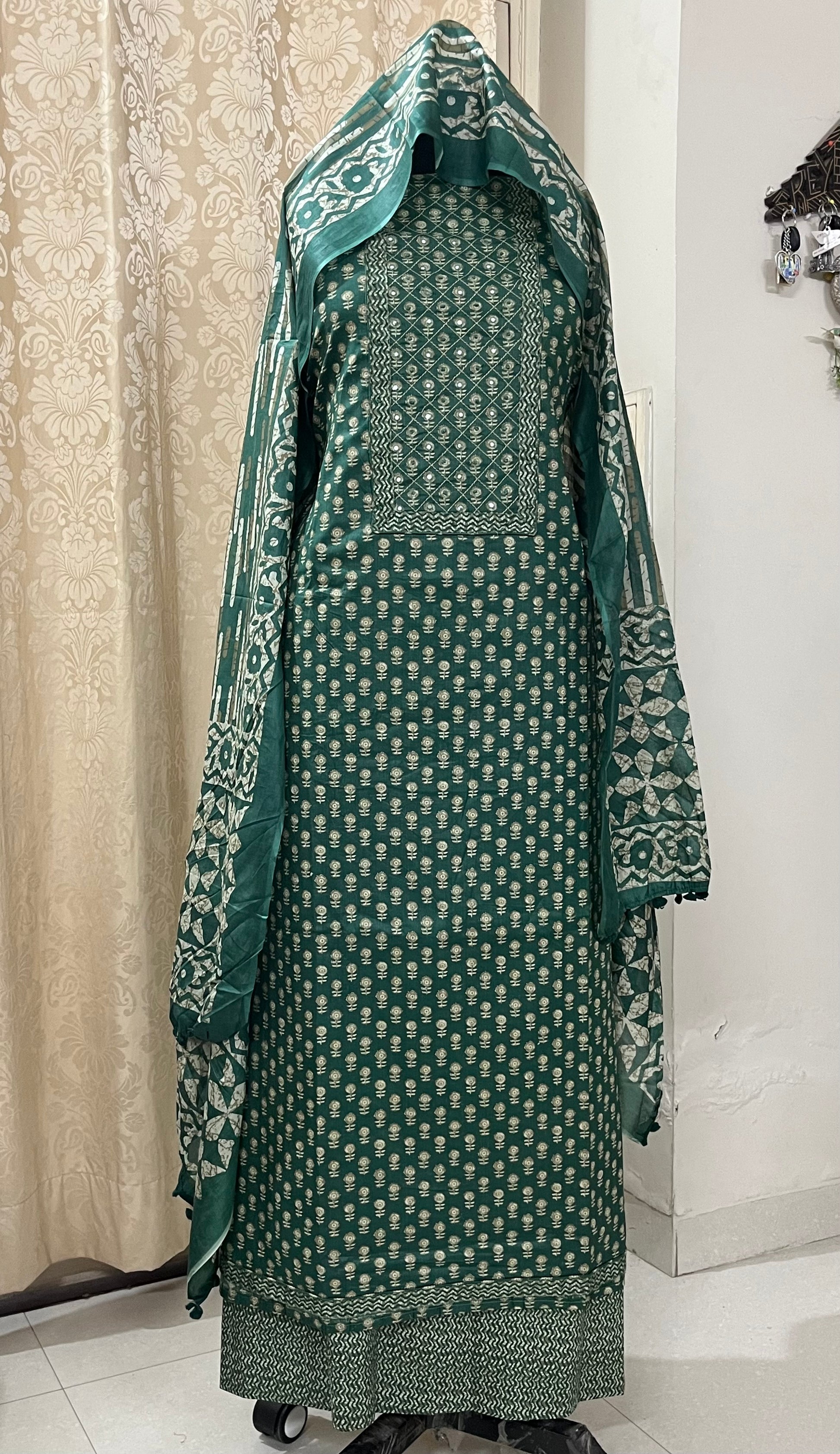 Paalki Pure Cotton Suit Set with Knot & Mirror Work Neck Patch - Bottle Green