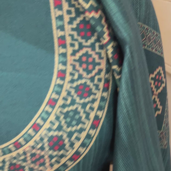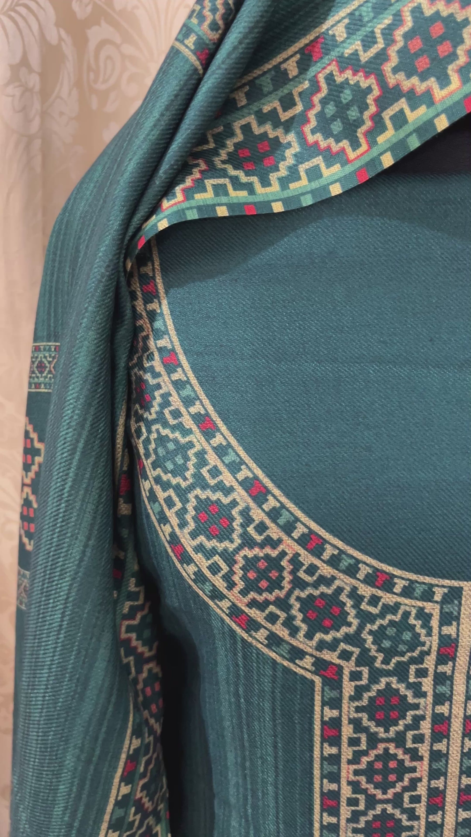 The rich peacock green kurta features a beautifully designed neckline adorned with digitally printed Kullu-inspired borders. Paired with a plain red bottom for balance, the set comes with a stunning printed stole that beautifully complements the entire look with its traditional Kullu motifs.