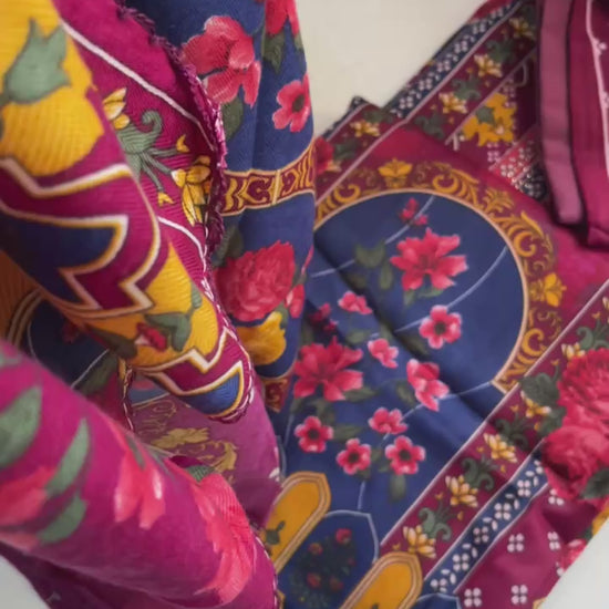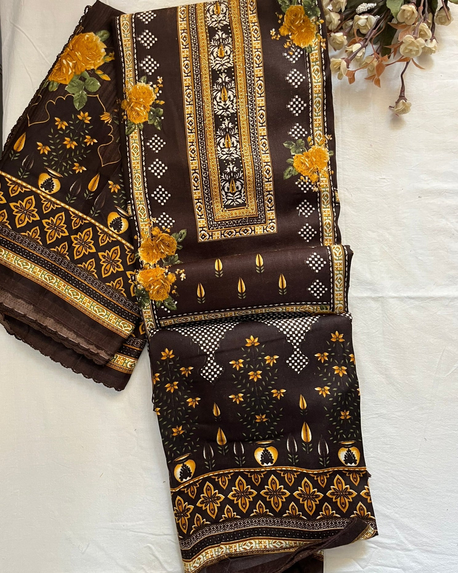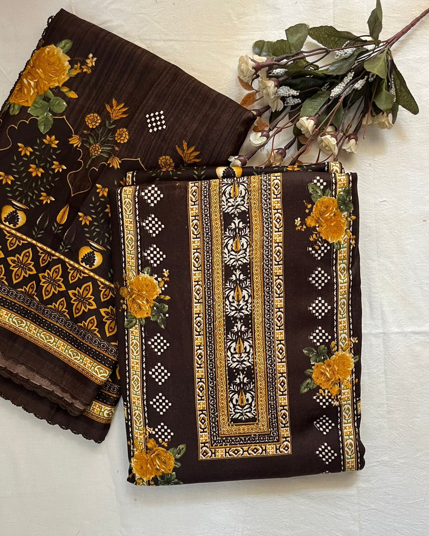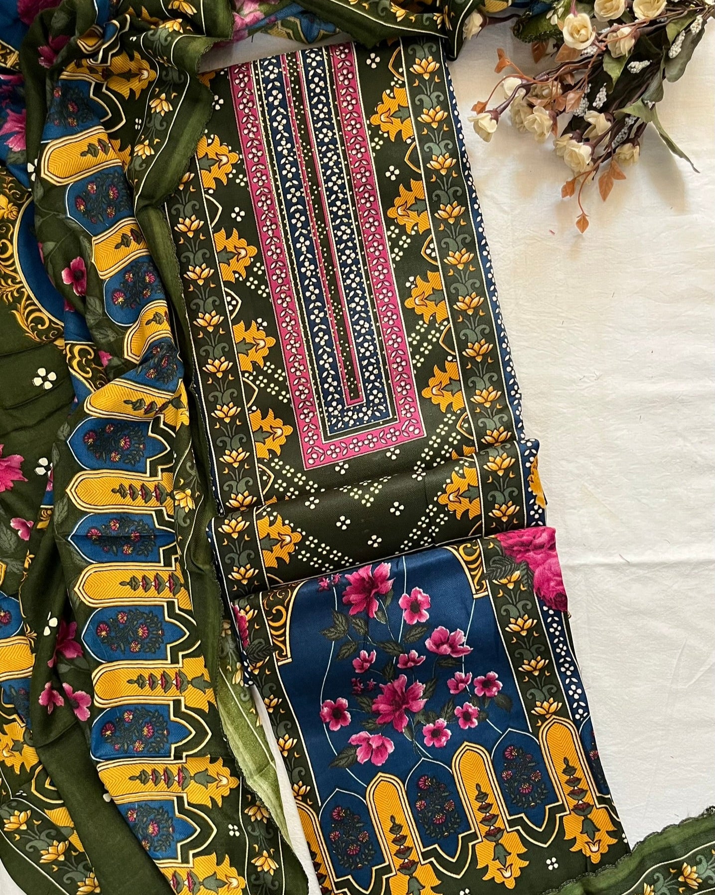 Elegant pashmina spun suit featuring digital-style prints on the shirt, paired with a plain bottom for balance. The digitally printed stole is finished with delicate lace detailing, adding a refined touch. Soft, warm, and stylish, making it perfect for light winters and festive gatherings.