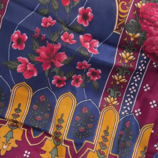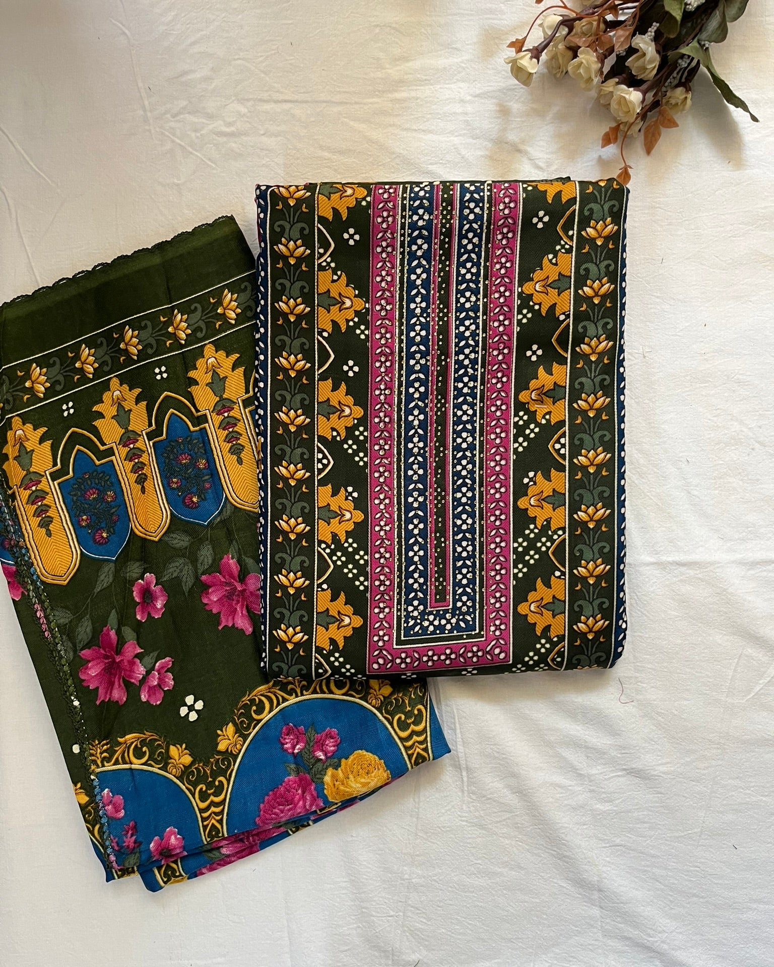 Pashmina Spun Digital Print Suit with Lace-Detail Stole & Plain Bottom