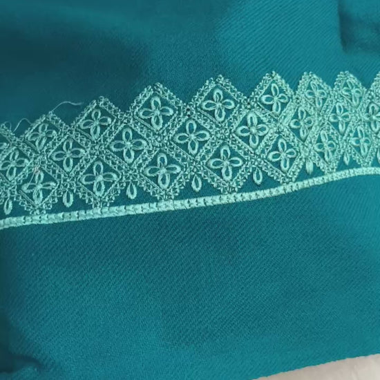 Extremely soft and warm acrylic wool suit in peacock green, with embroidered neckline and daman border. Comes with a matching stole, perfect for heavy winters and party wear.