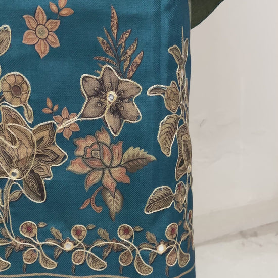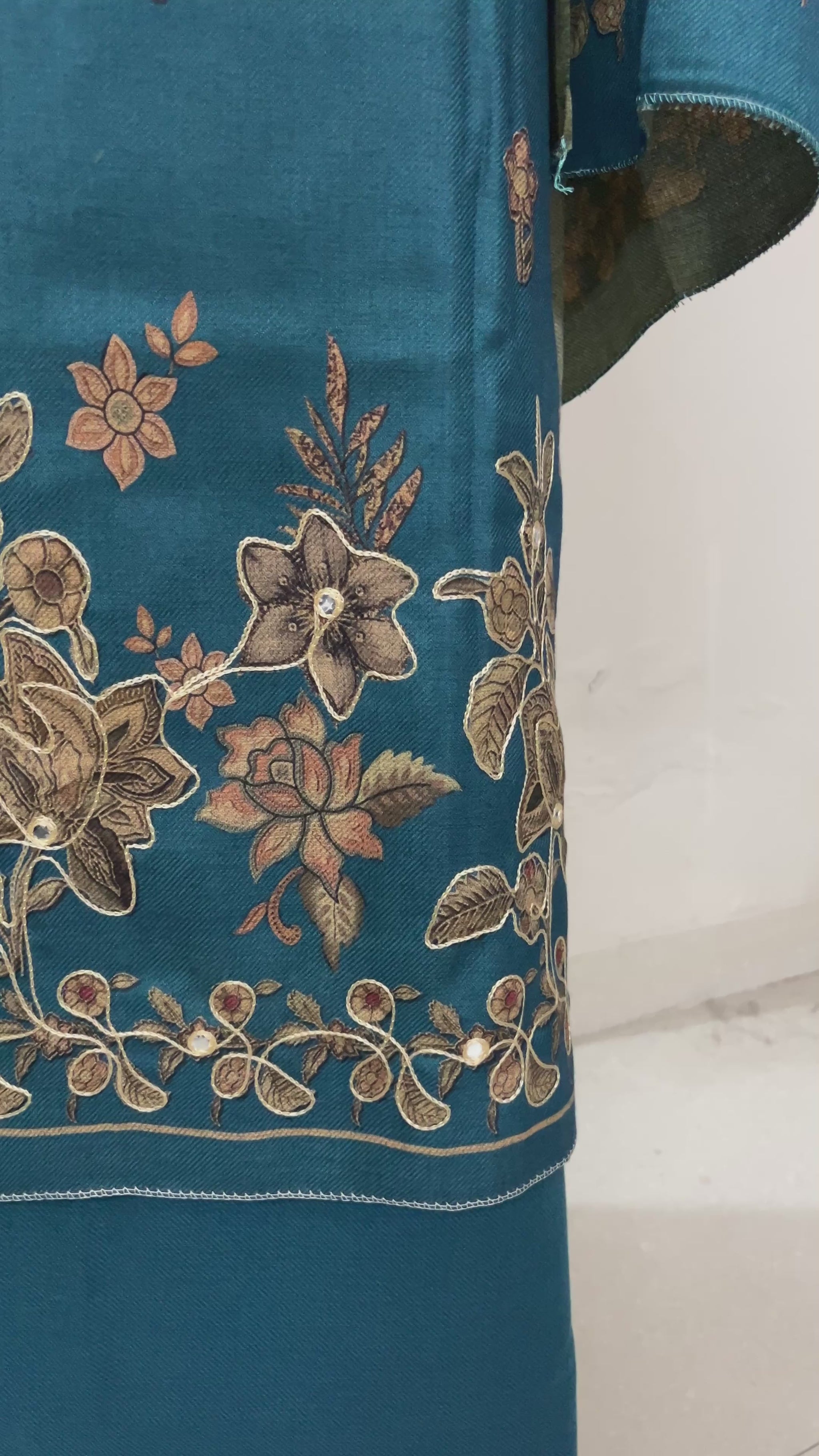 Phool Aari-Work Toosh Pashmina Woolen Suit - Firozi