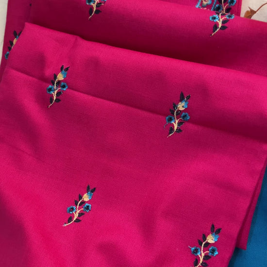 Pretty pink wool blend suit featuring light blue, black, and beige floral embroidery with delicate booti work all over. The fabric is very soft, durable, and lint-free after multiple washes. Paired with a plain blue stole with tassels, this suit is perfect for both daily and work wear.