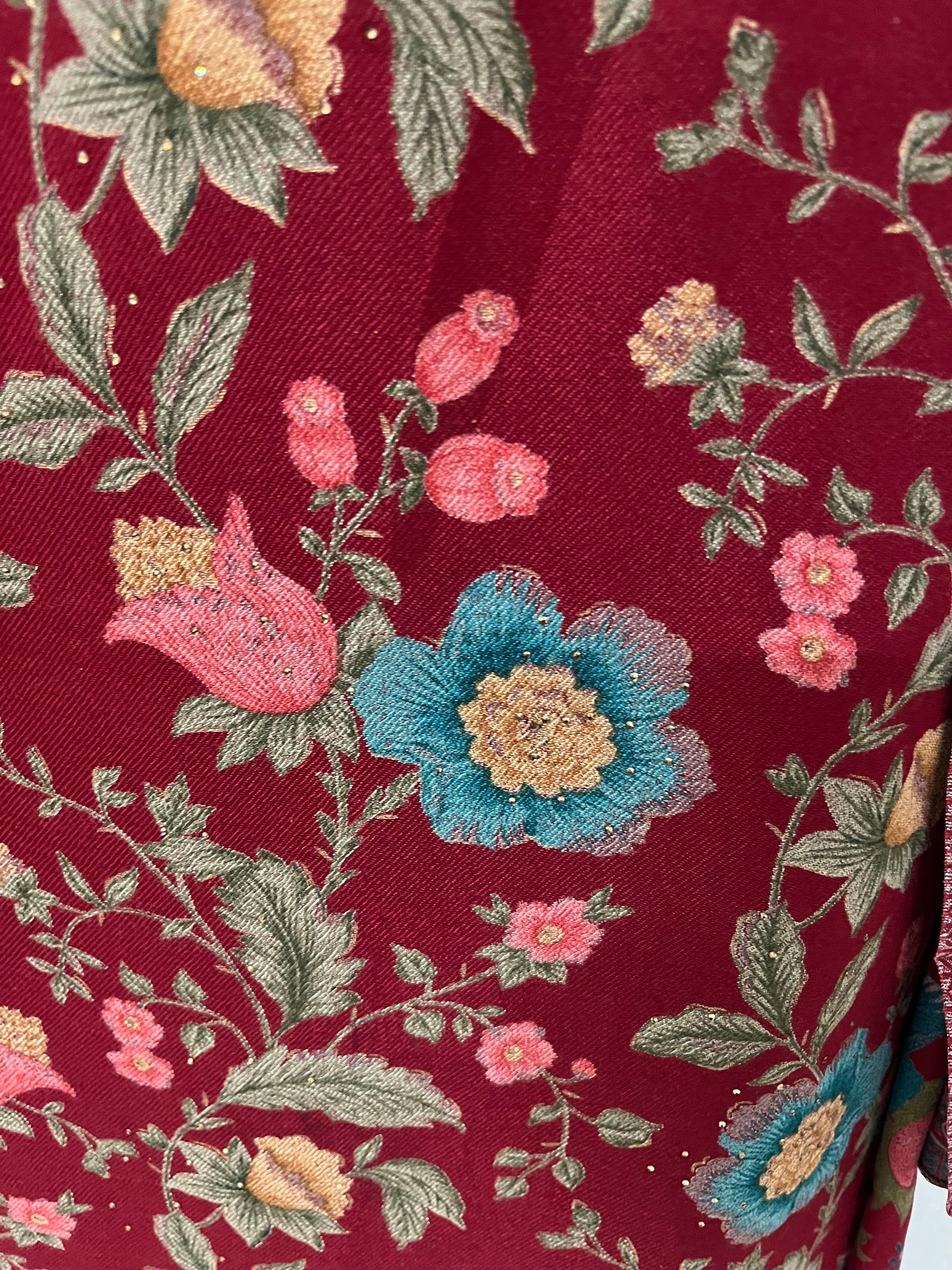 This Ruby Red Pure Spun Wool Suit is a perfect blend of winter comfort and elegant detailing. The suit features an all-over digital floral print, enhanced with subtle Swarovski highlights that add a soft shimmer without looking heavy.