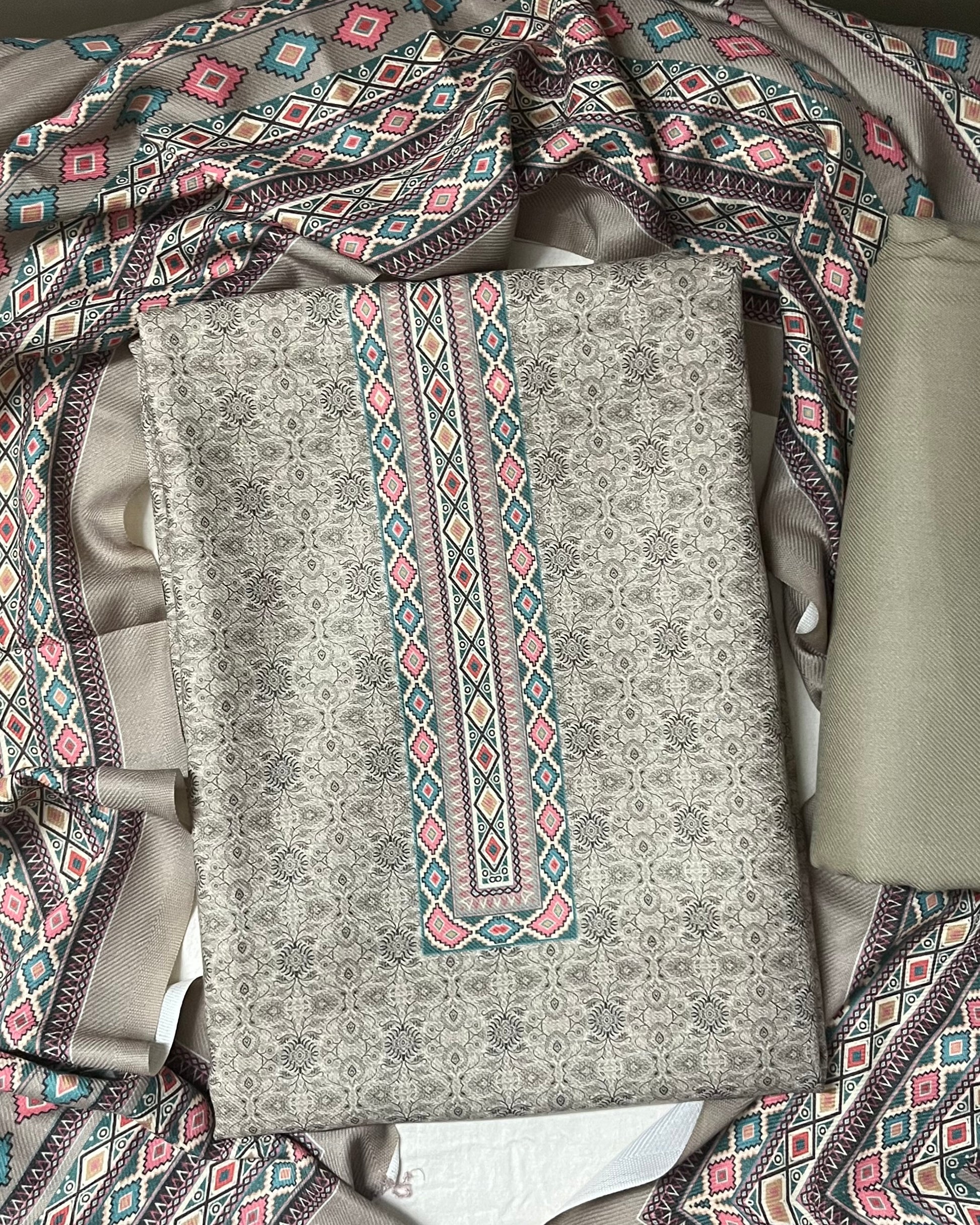Embrace soft femininity with our gorgeous Stone Grey Woolen Suit. The rich, premium-quality Toosh Pashmina fabric provides a luxurious feel and exceptional warmth.