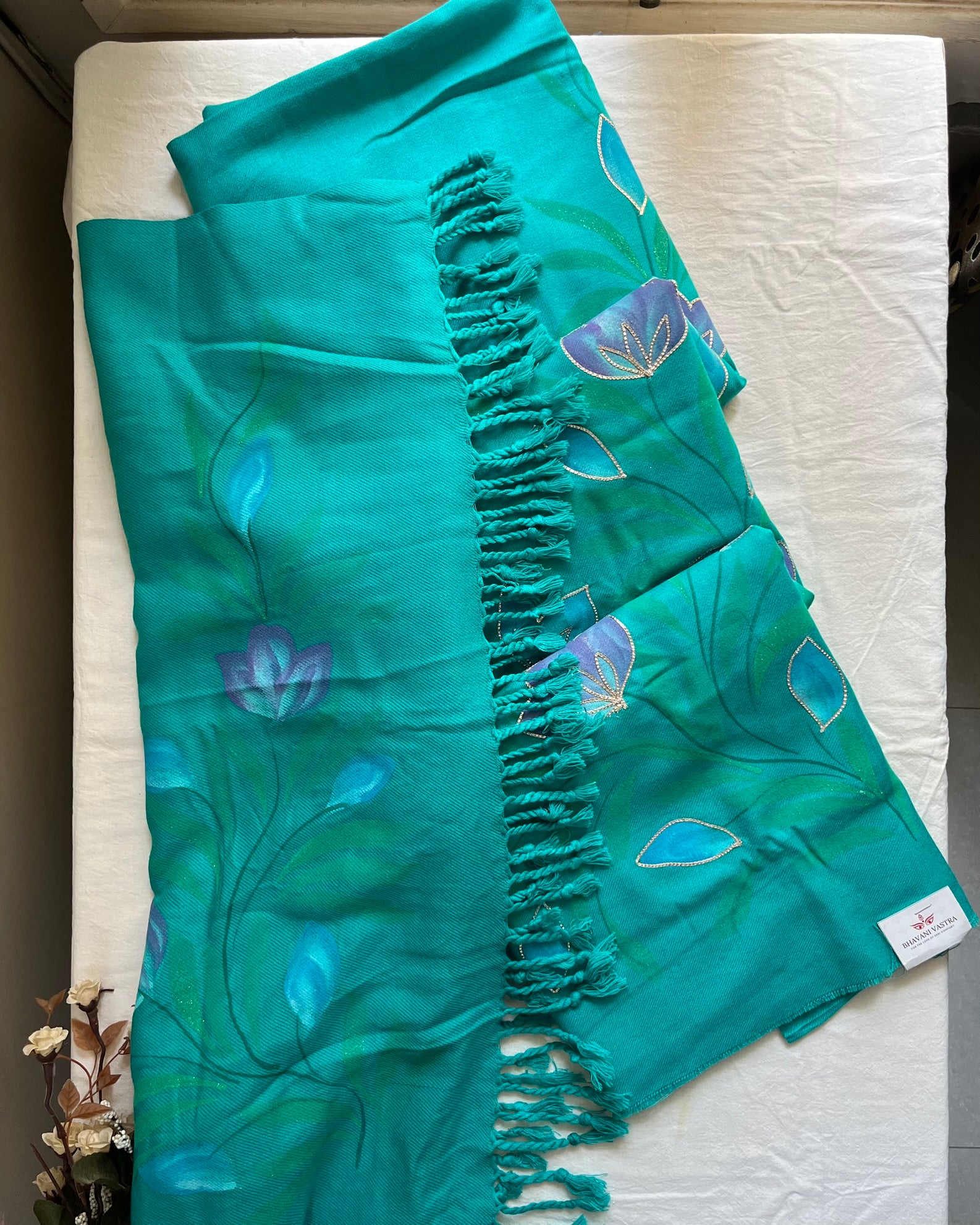 Turn heads this winter with this teal blue woolen suit, hand-painted with delicate floral motifs and a subtle shimmer for that modern, polished look. The soft, warm fabric ensures comfort without lint, no matter how many washes. Perfect for parties, kitty gatherings, and festive evenings, this suit comes with a matching design on sleeves and a brush-painted stole that completes the chic yet desi vibe.