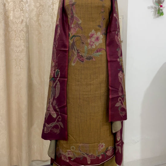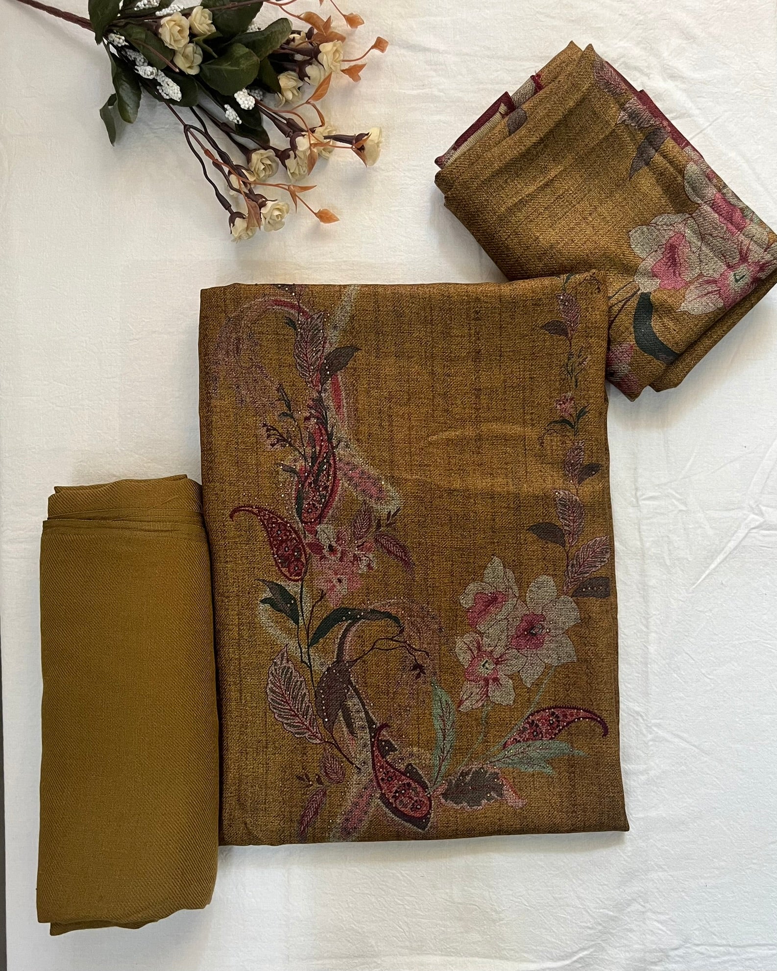 This Yellow and Red Woolen Suit is a beautiful blend of warmth and festive charm. Made from wool lurex fabric, it has a gentle shine that adds a touch of luxury while keeping you cozy and comfortable during winters. The elegant floral print on the bottom and neckline is enhanced with delicate Swarovski work, giving the suit a graceful sparkle.