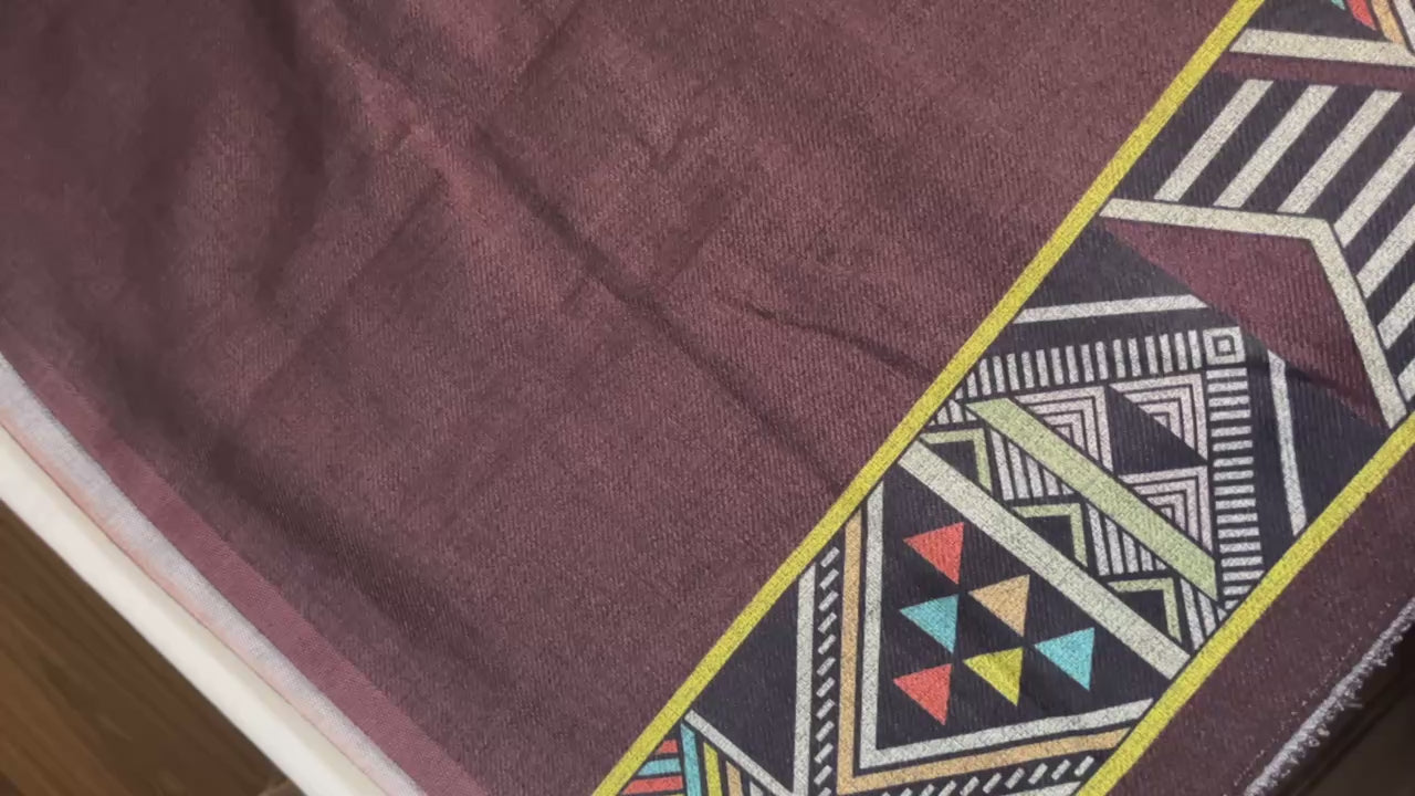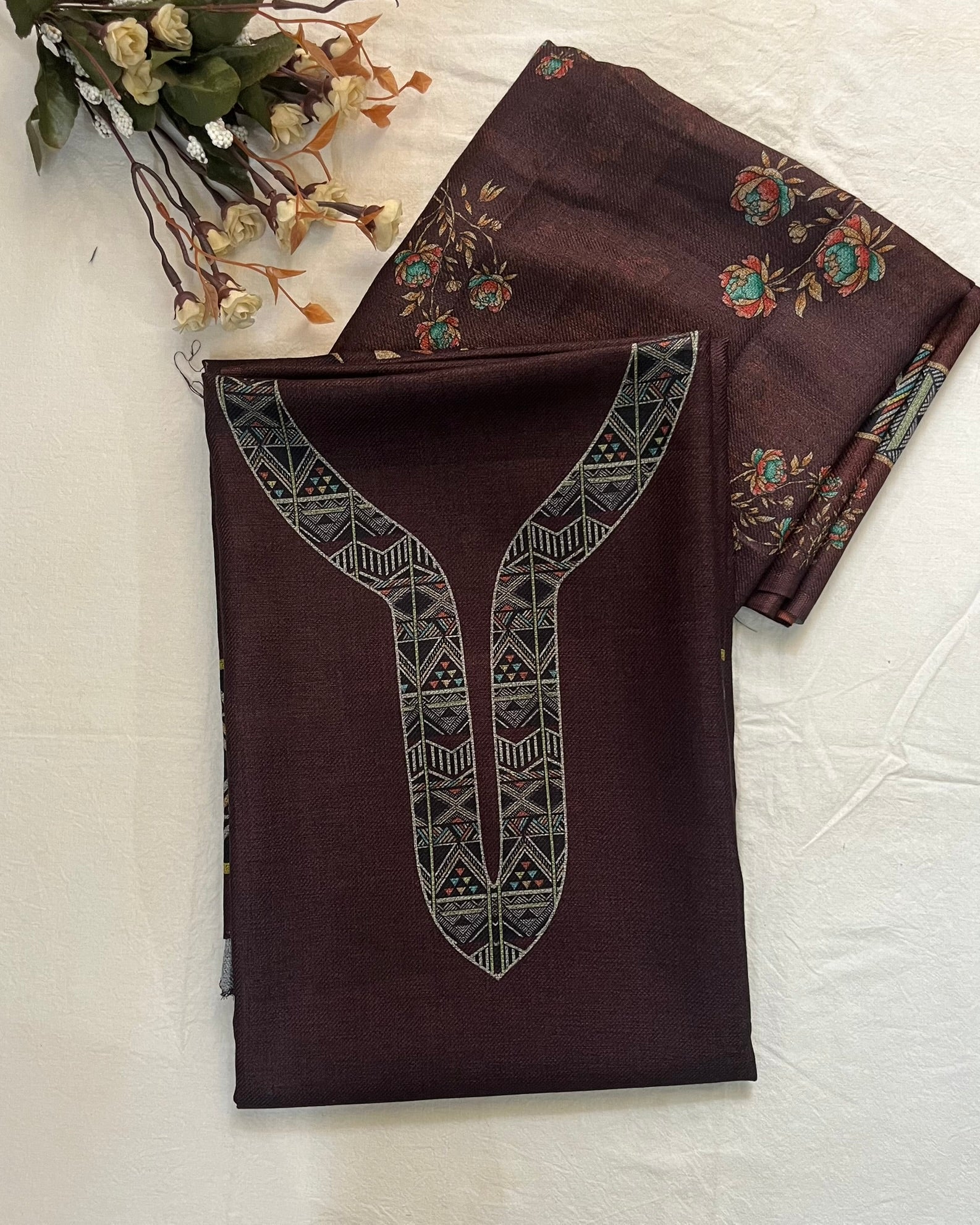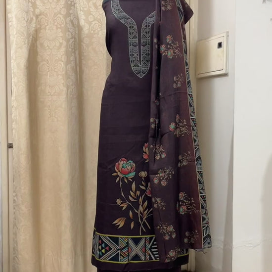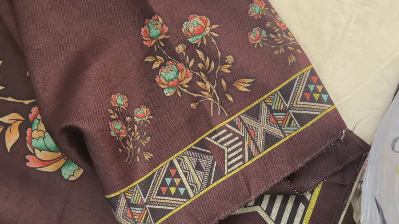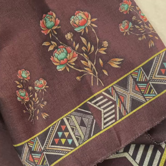 Woolen Suit with Digital Floral Print & Matching Stole - Coffee Brown