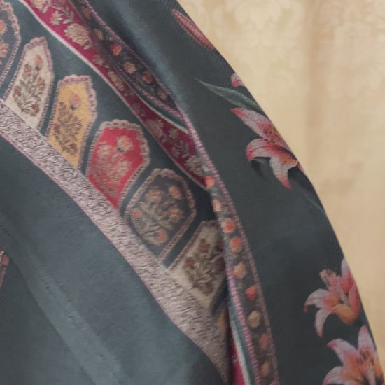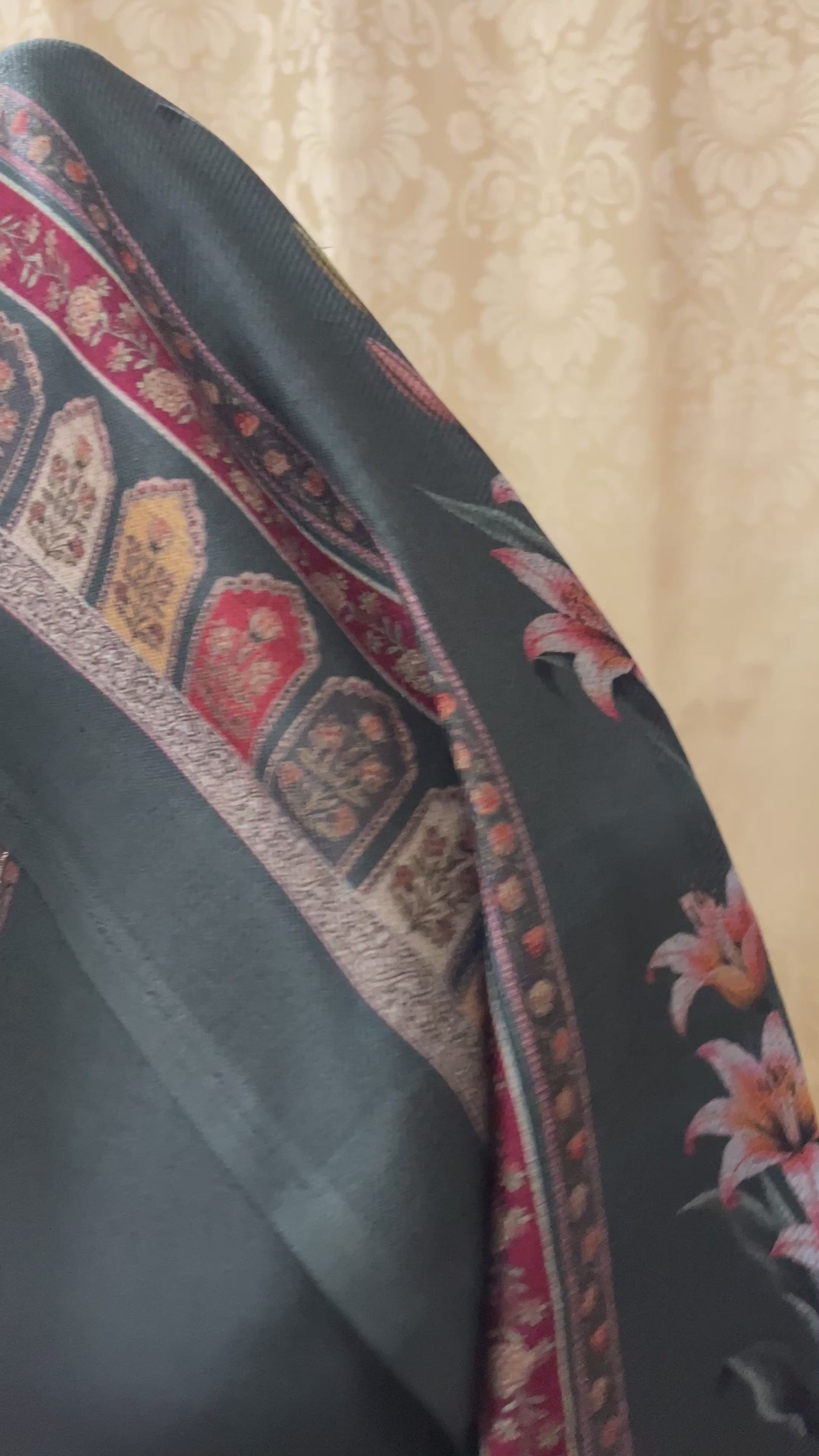 The matching printed stole completes the look with effortless harmony, while the plain woolen bottom keeps the outfit balanced and refined.